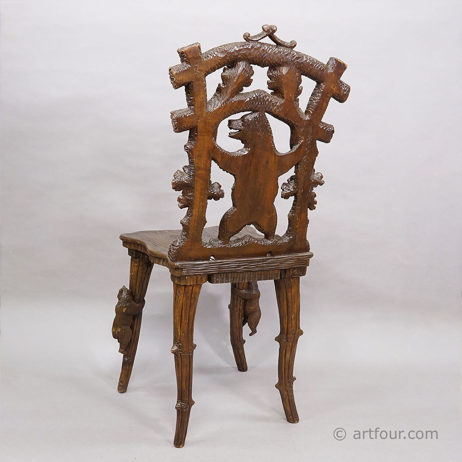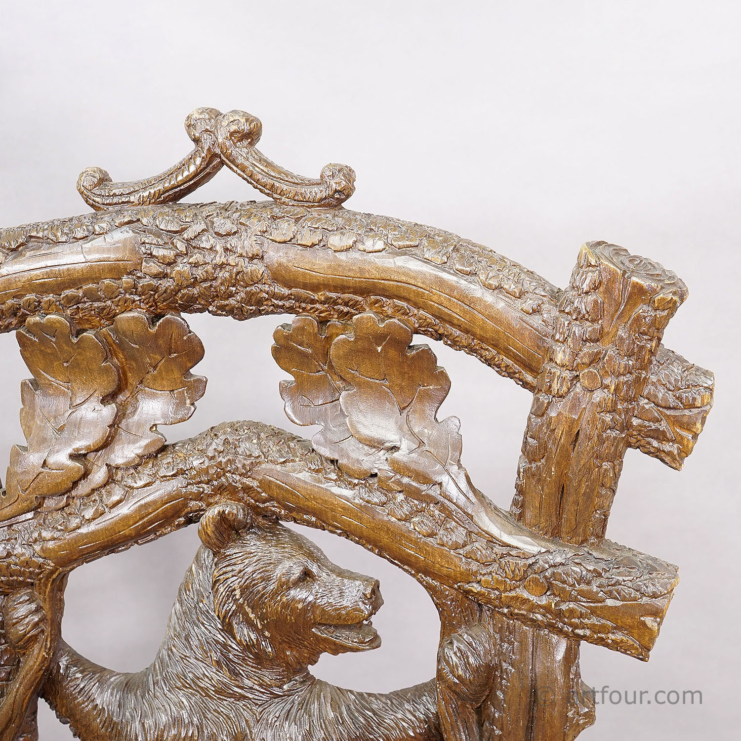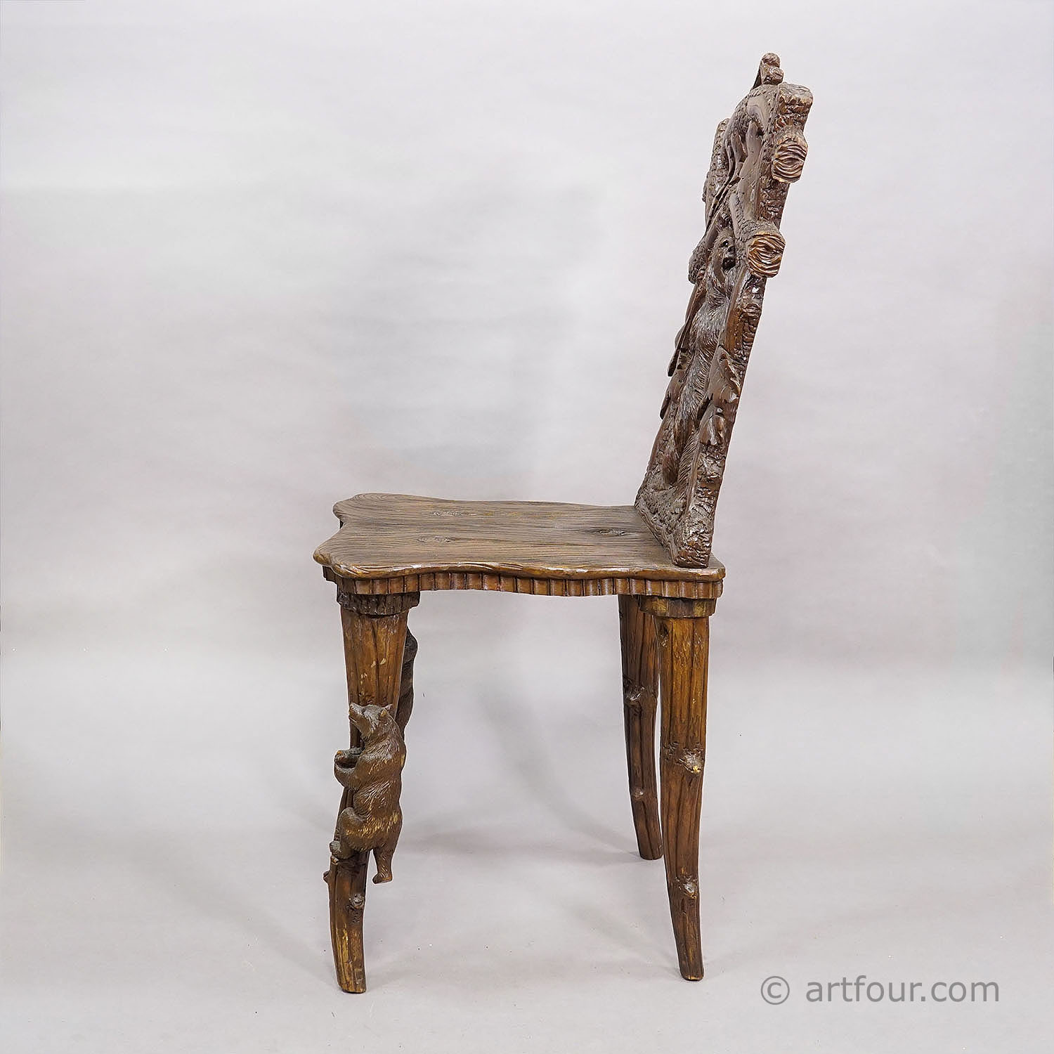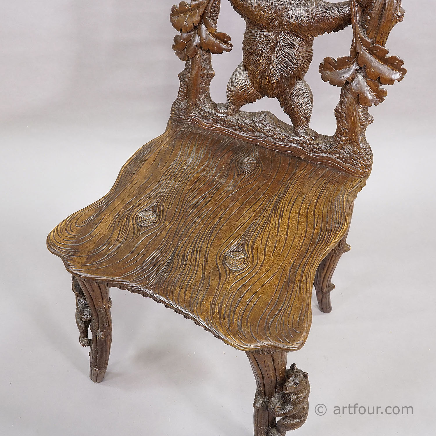 An exceptional hand-carved Black Forest bear chair dating to around 1880. Crafted in richly stained wood, the chair features a striking backrest with a fully sculpted standing bear framed by intertwined branches and oak leaves. The naturalistic seat imitates wood grain, while the legs are formed as tree trunks adorned with finely carved climbing bear cubs. Executed with remarkable detail and depth, this piece is a fine example of the celebrated woodcarving tradition at the turn of the 20th century in Brienz, Swizerland. Both sculptural and functional, it serves as a rare statement piece for collectors of alpine folk art, hunting décor, or antique rustic furniture.