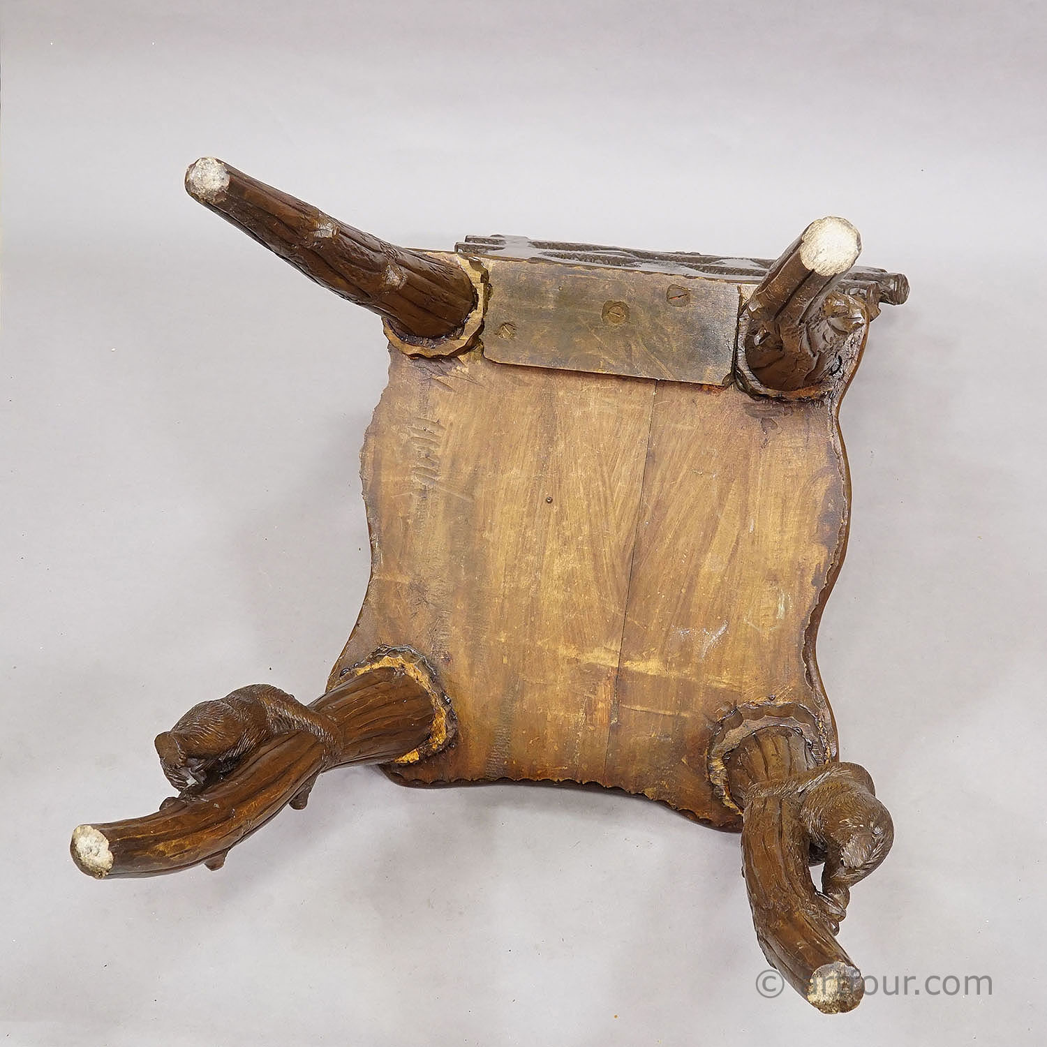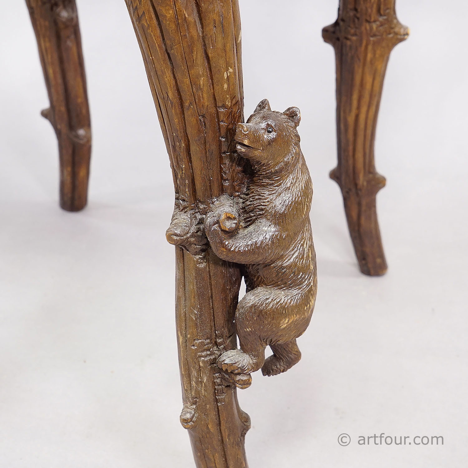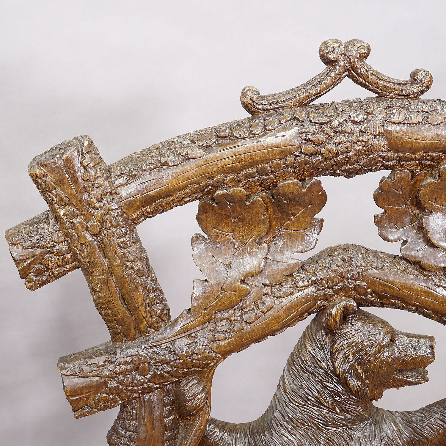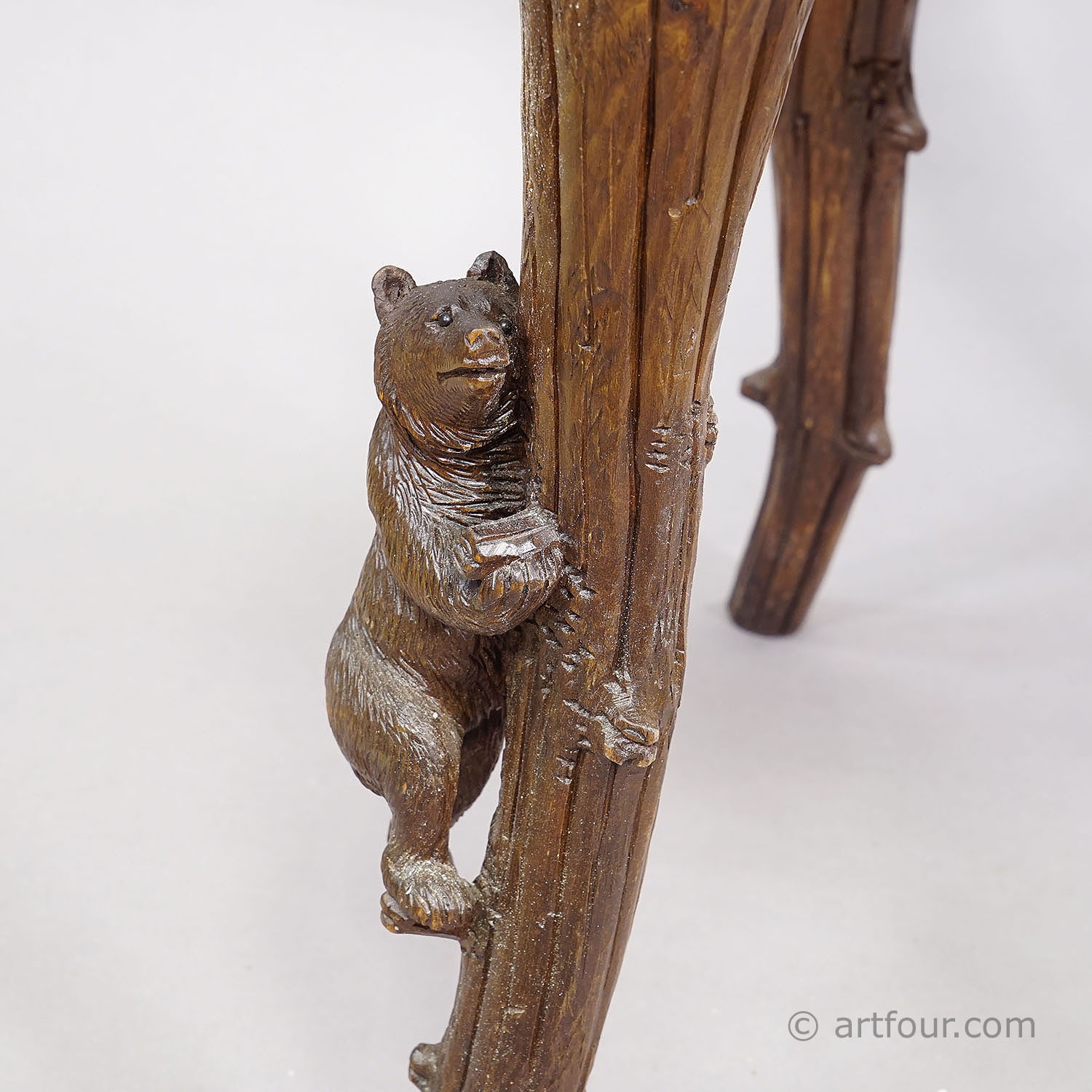 An exceptional hand-carved Black Forest bear chair dating to around 1880. Crafted in richly stained wood, the chair features a striking backrest with a fully sculpted standing bear framed by intertwined branches and oak leaves. The naturalistic seat imitates wood grain, while the legs are formed as tree trunks adorned with finely carved climbing bear cubs. Executed with remarkable detail and depth, this piece is a fine example of the celebrated woodcarving tradition at the turn of the 20th century in Brienz, Swizerland. Both sculptural and functional, it serves as a rare statement piece for collectors of alpine folk art, hunting décor, or antique rustic furniture.