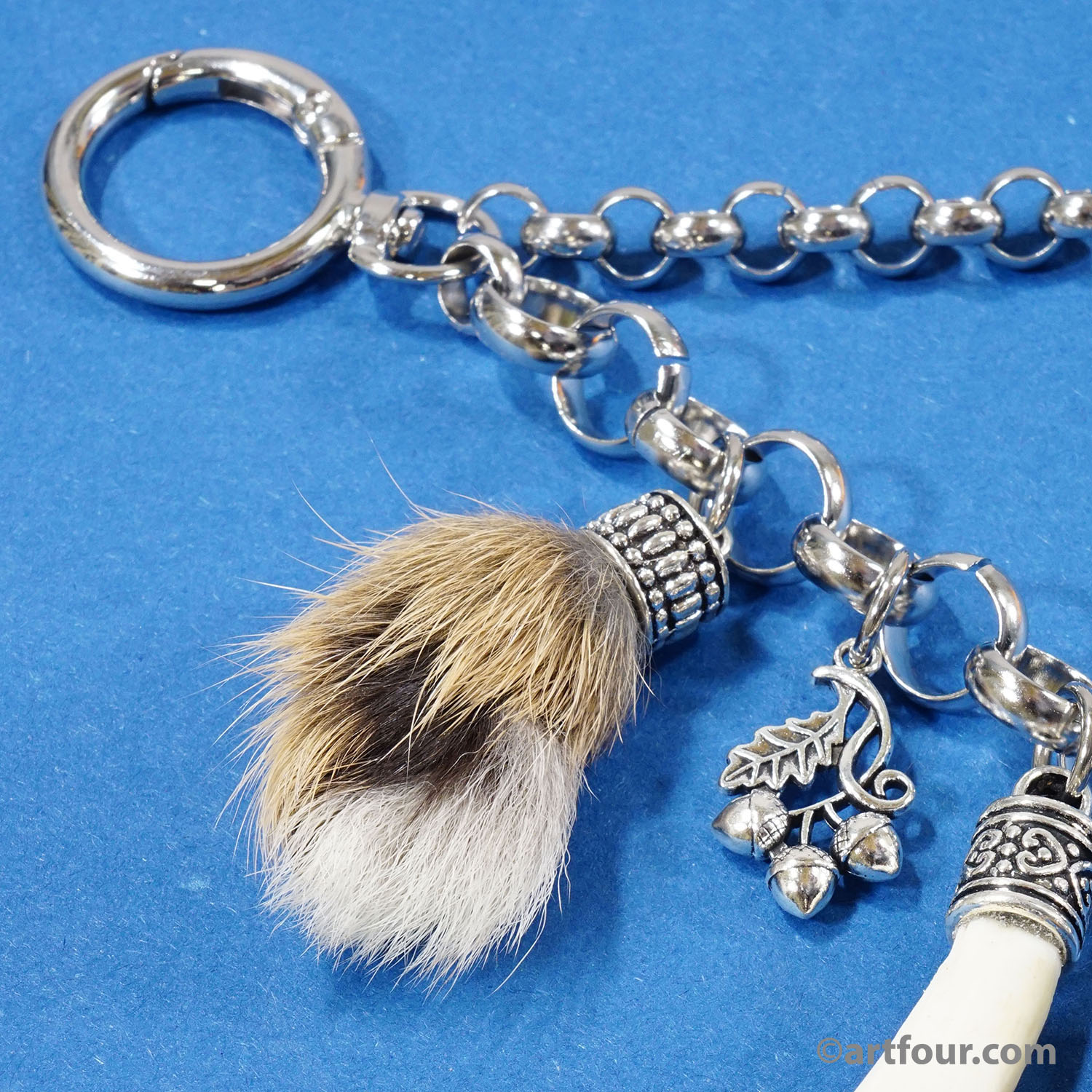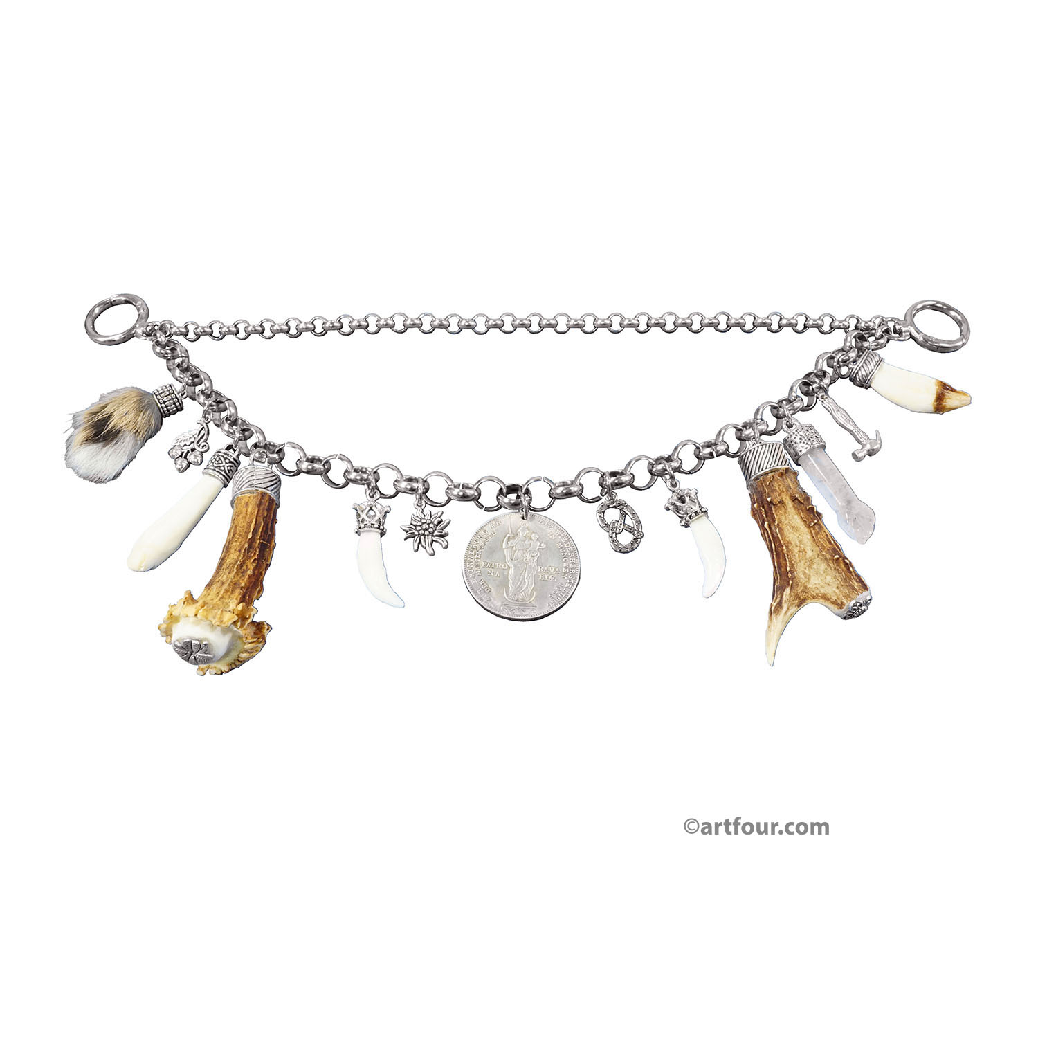 A Bavarian Charivari from the middle of the 20th century. A beautiful piece of historical Bavarian folk art jewelry, a real collector's item. A charivari is a traditional piece of Bavarian costume jewelry. It is worn by men on the bib of their traditional leather pants. The charivari was used as jewelry or as a talisman for a successful hunt and is a valuable status symbol for the wearer. This example is quite heavy and robust and features thirteen rare pieces of jewelry: two fox teeth, a rock crystal, a silver pretzel, a small silver hammer, a silver Edelweiss, a silver charm of three acorns and a leaf, 'Patrona Bavariae' design coin, two stunted horns ("Kümmerer"), a horn pendant, a wild boar tooth and a piece of hare fur.