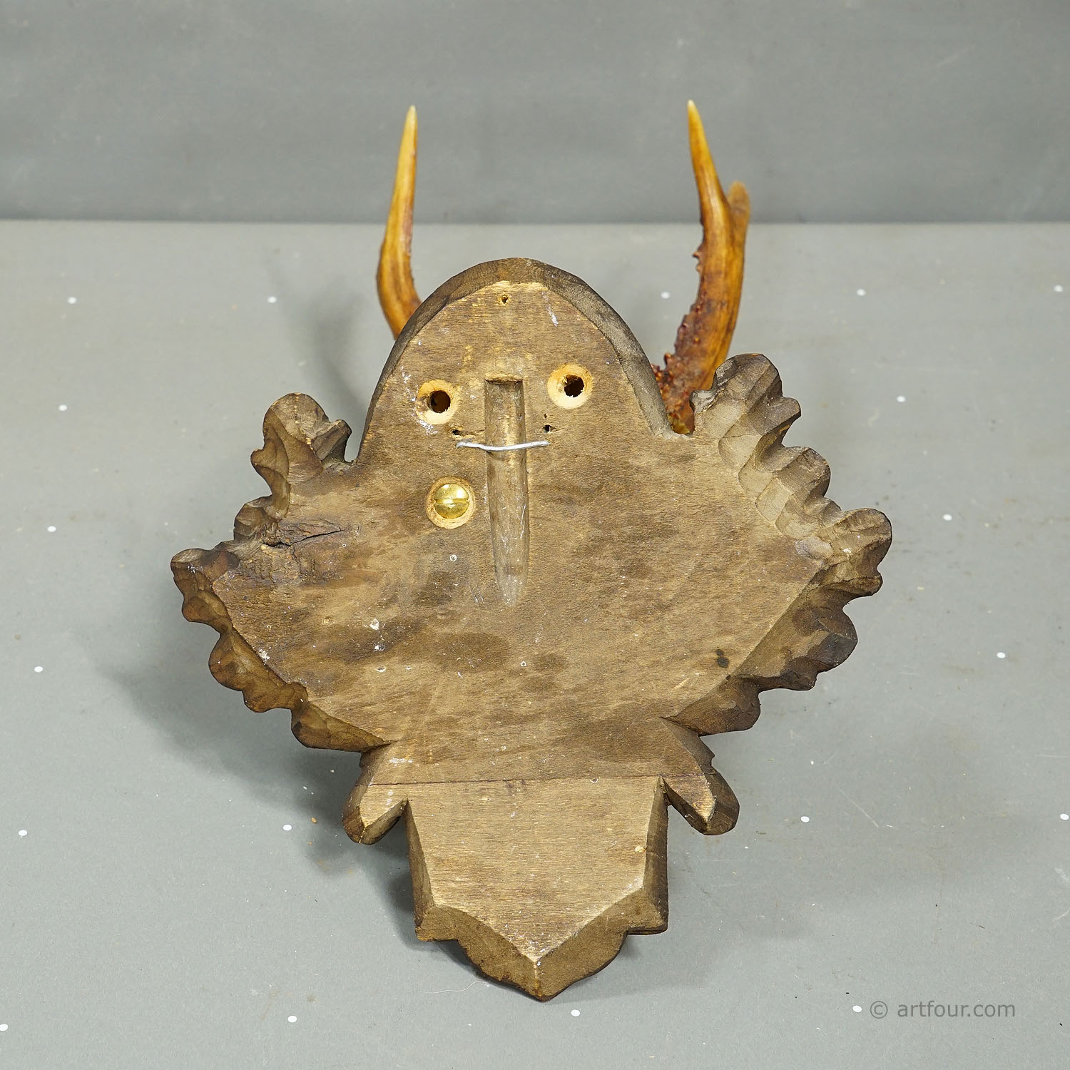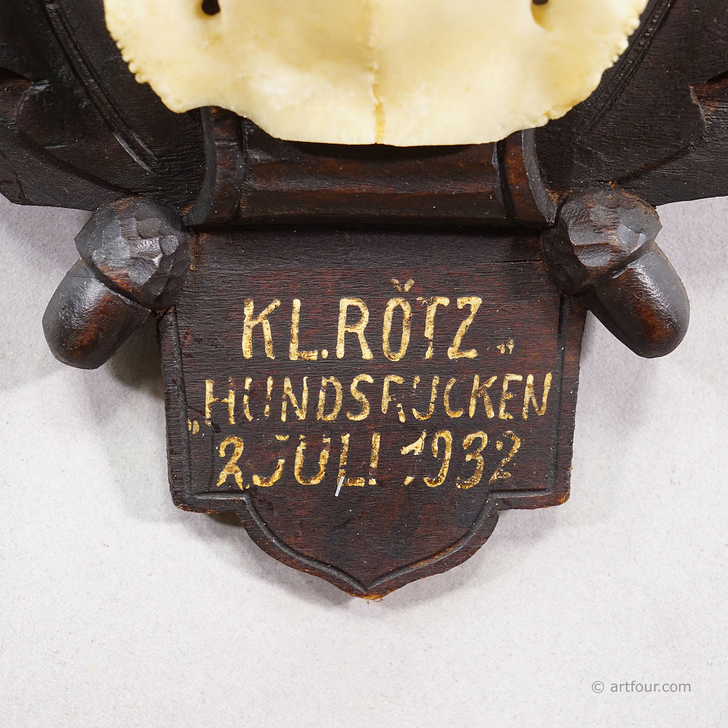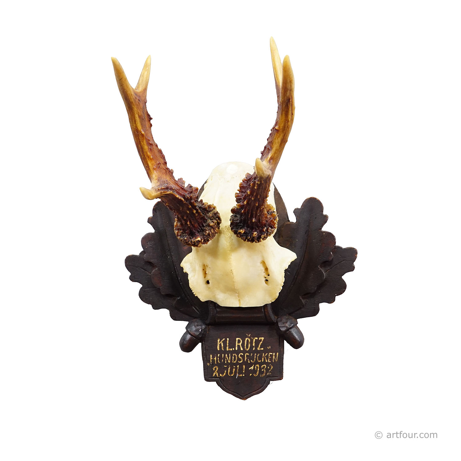 An antique red deer (Capreolus capreolus) trophy on a wooden carved plaque with dark brown finish. The trophy was shot in 1932. Good condition with handpainted inscription of date and place of the hunt on the plaque.