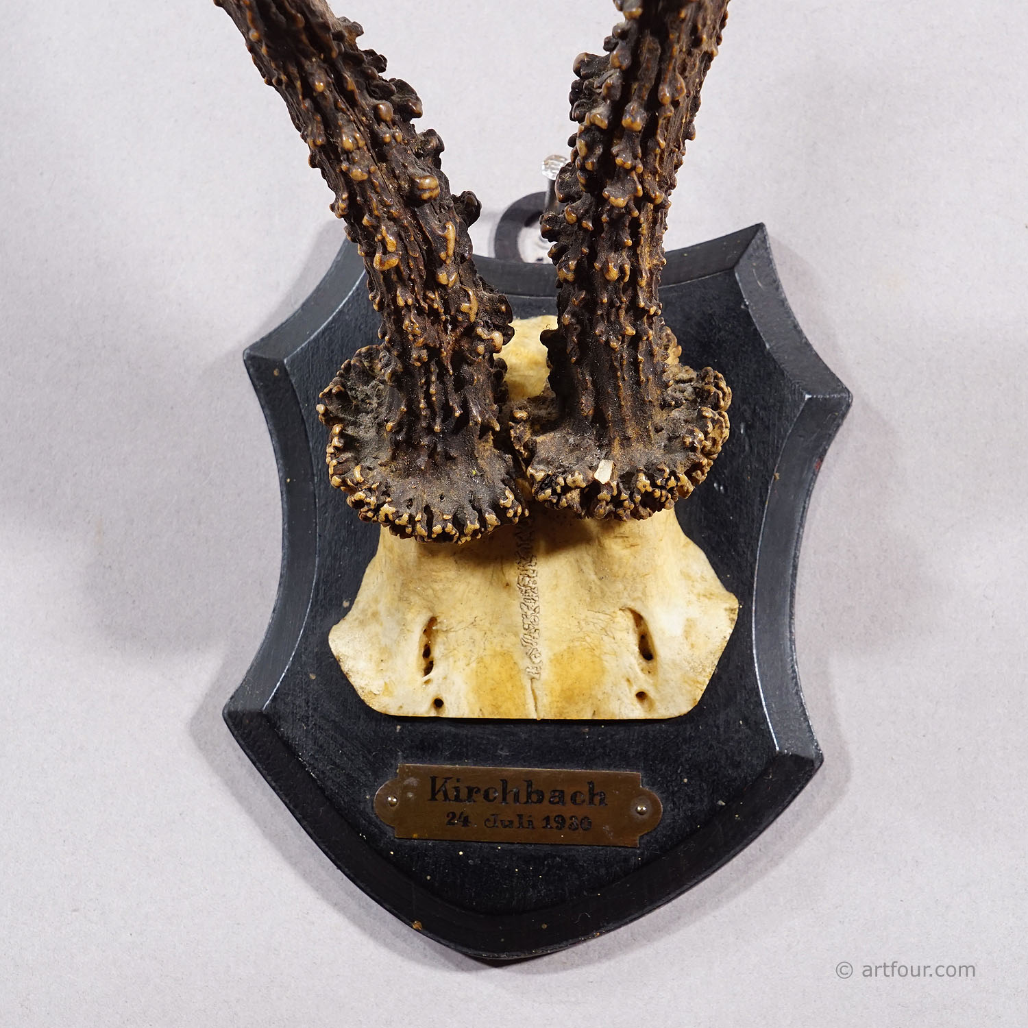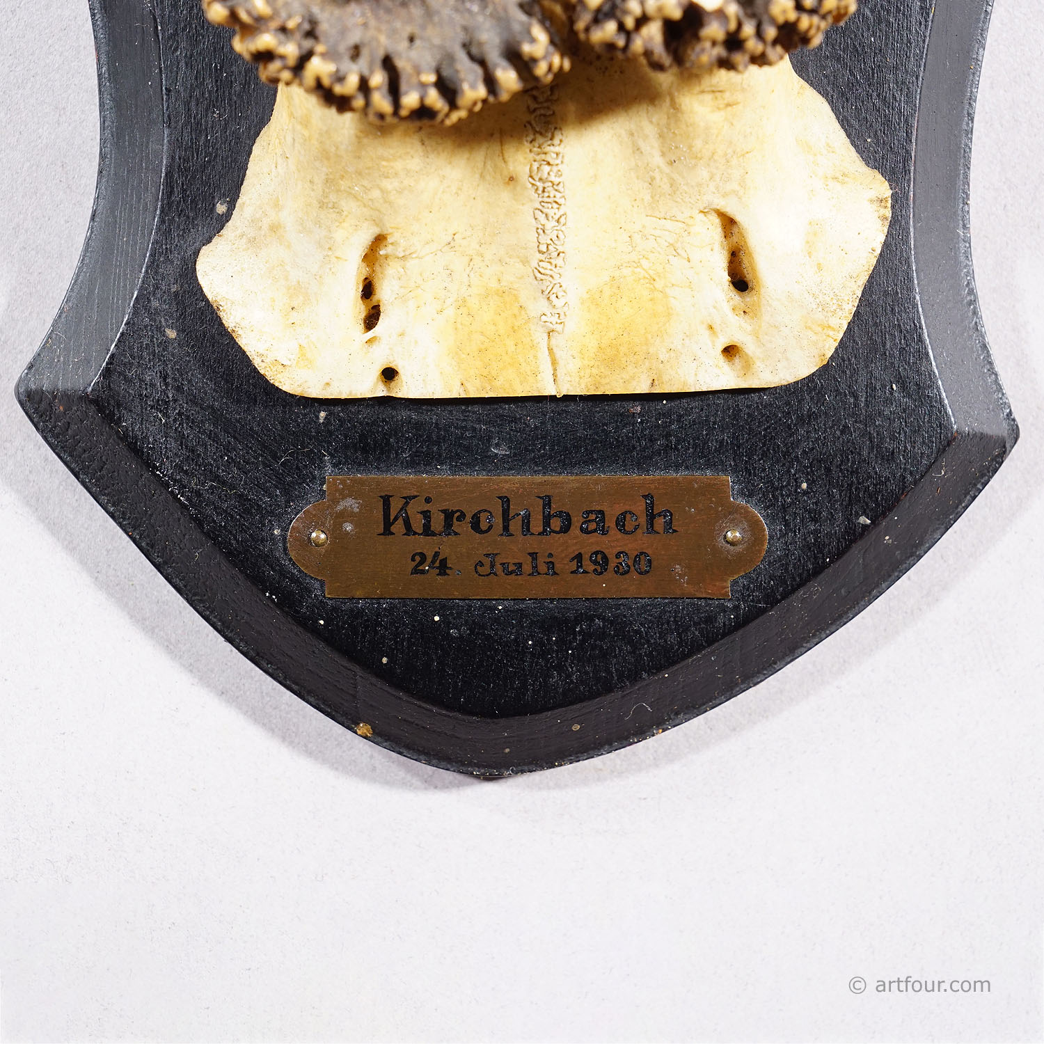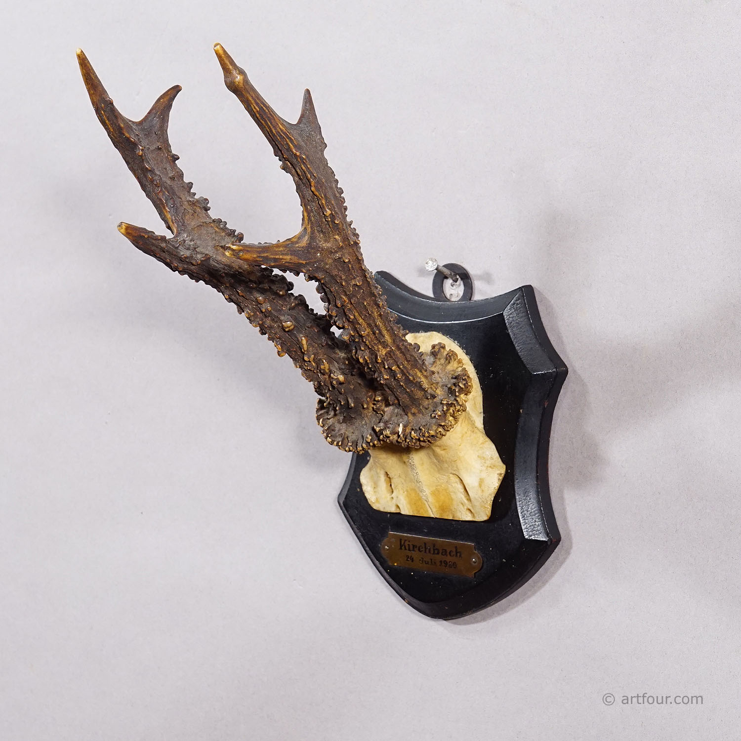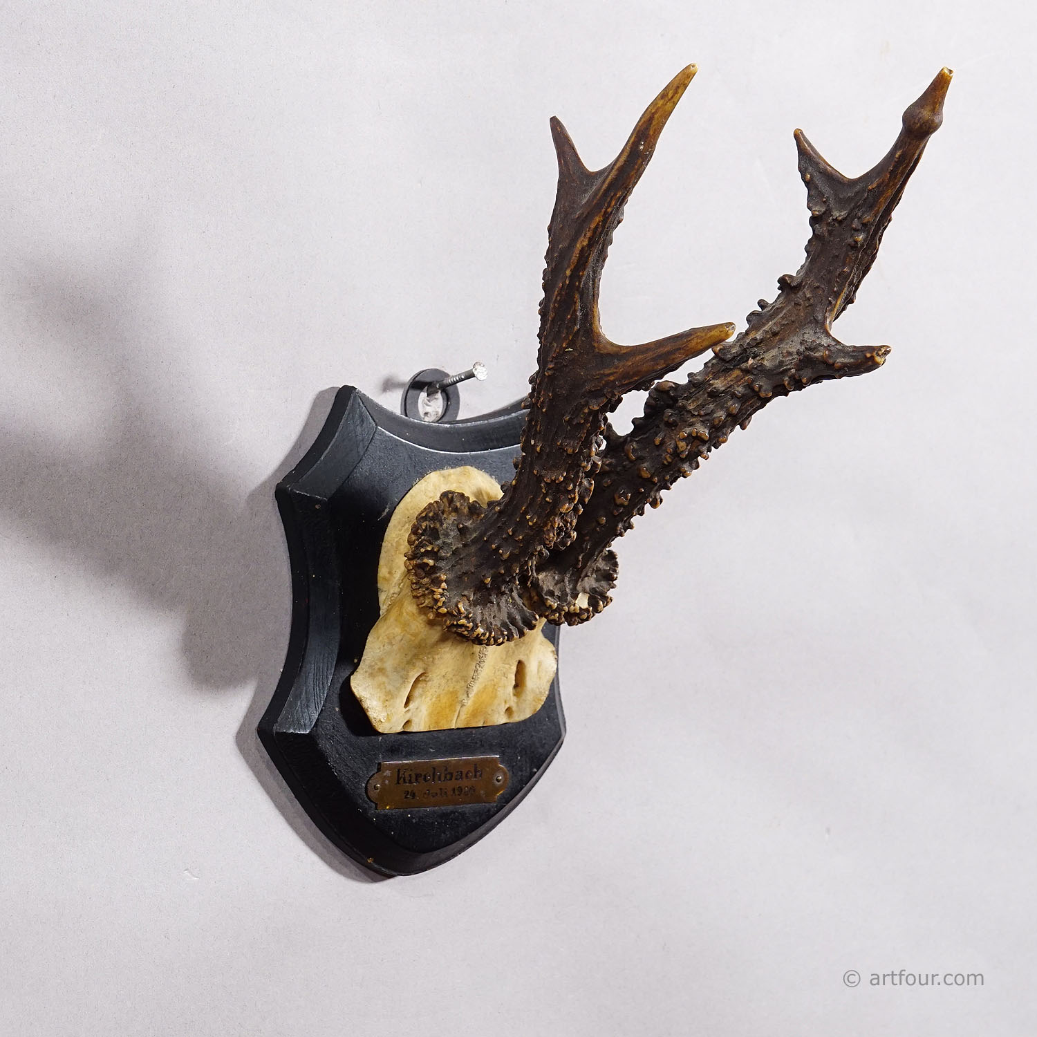 An antique red deer (Capreolus capreolus) trophy on a wooden carved plaque with dark brown finish. The trophy was shot in 1930. Good condition with engraved inscription of date and place of the hunt on a metal plate mounted on the plaque.