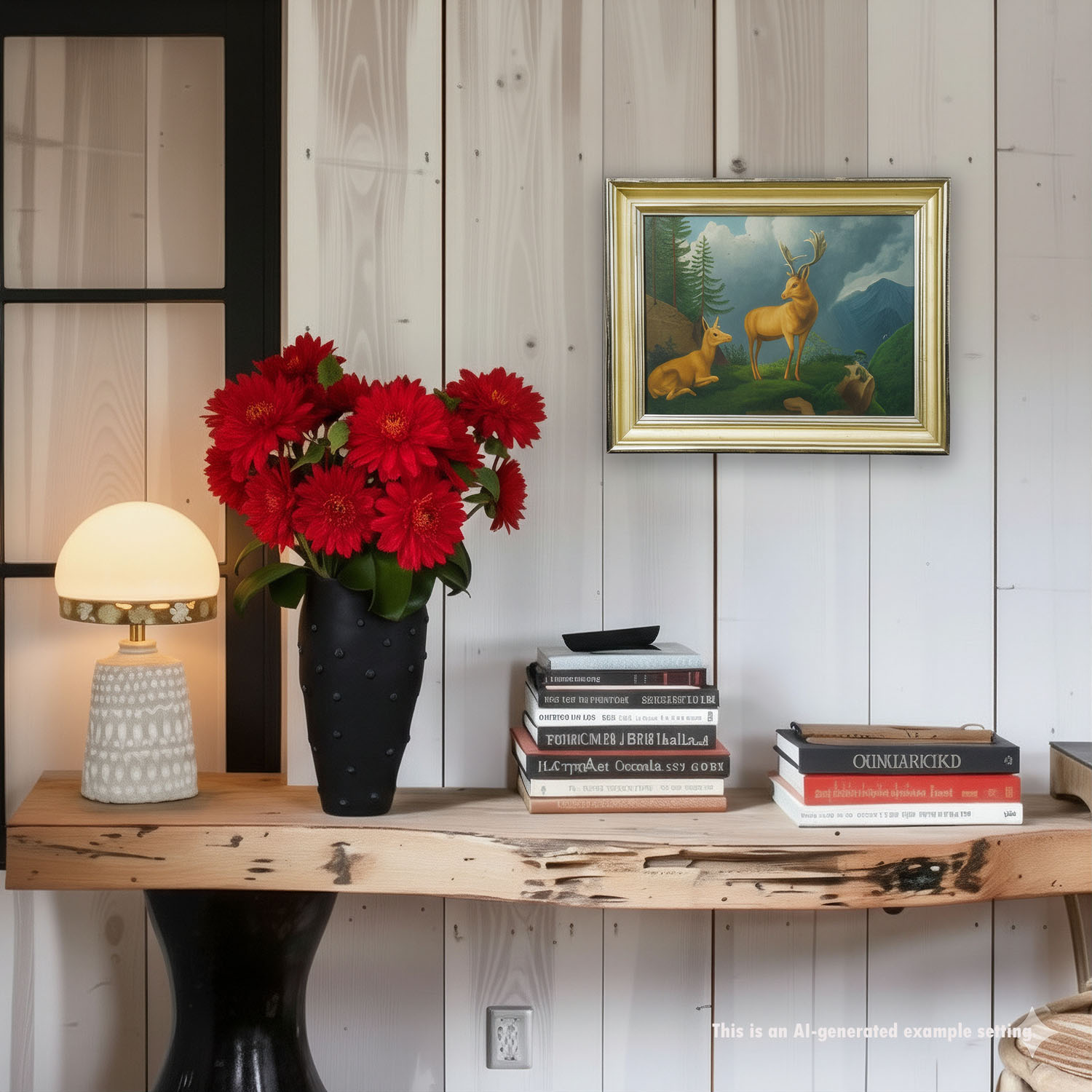A lovely Biedermeier style oil painting depicting a fallow deer family in the alpine landscape. Oil on canvas 1st halve of the 19th century. Framed with antique gilded frame, stretcher frame replaced. A marvelous wall decoration for each rustig log cabin.