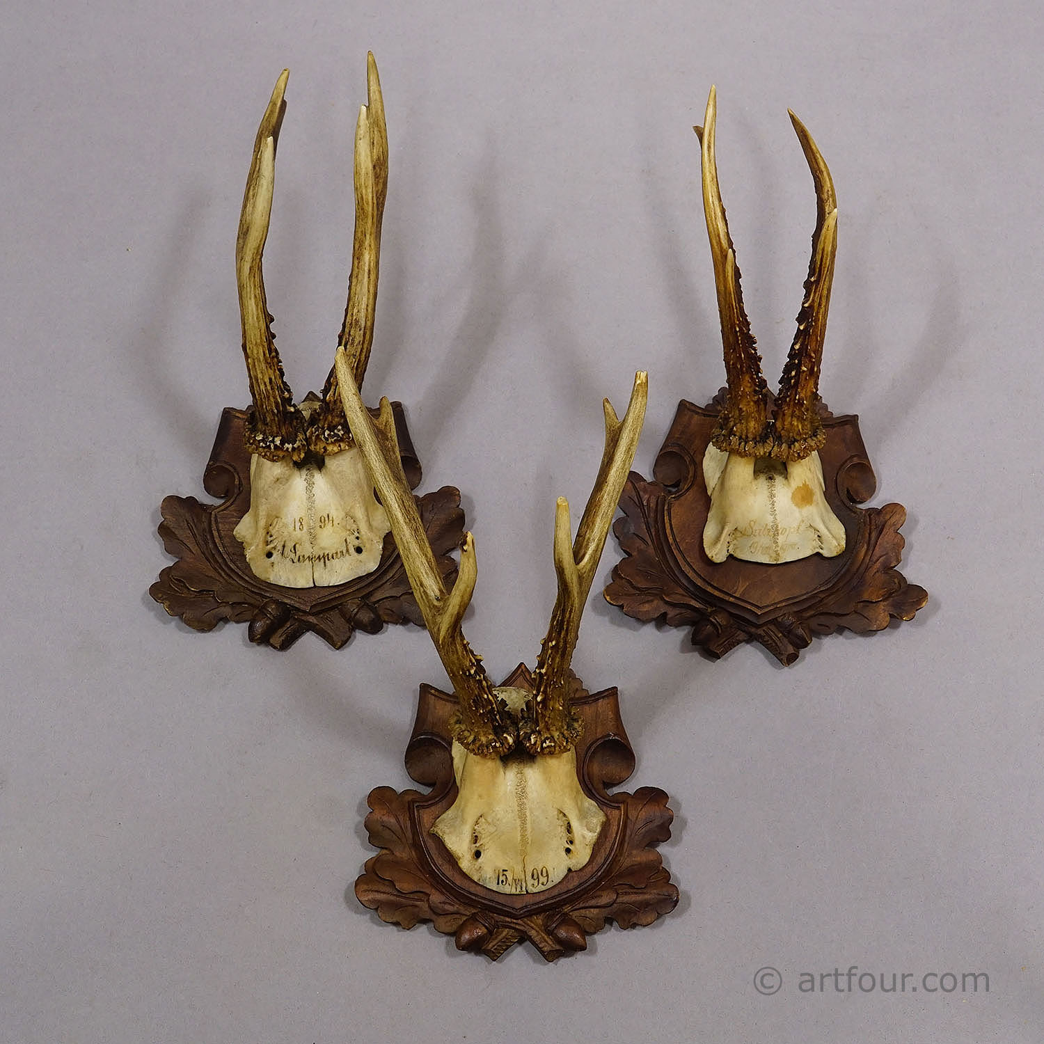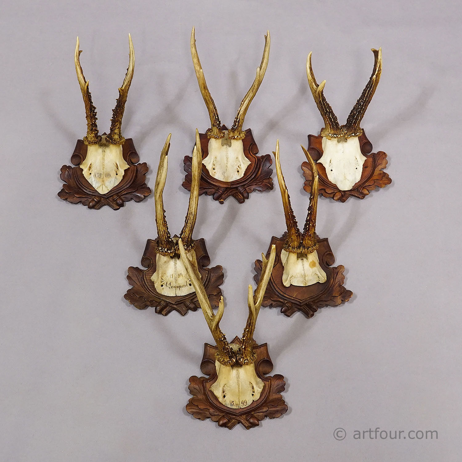 An elegant set of six antique roe deer (Capreolus capreolus) antler trophies, dating to the early 20th century, each mounted on finely carved wooden plaques. The backings are richly detailed with oak leaves and acorns, a traditional hunting motif that enhances their decorative appeal.