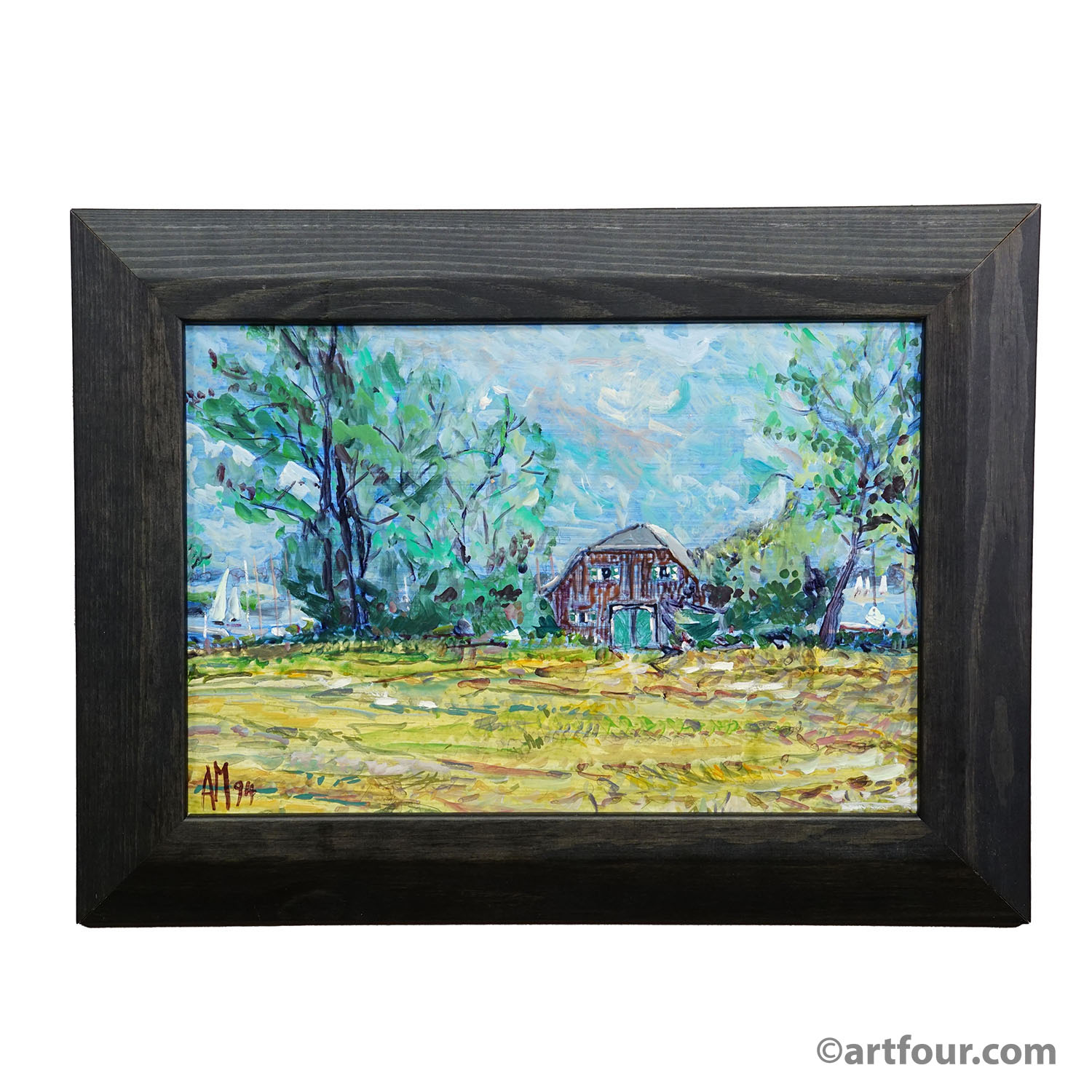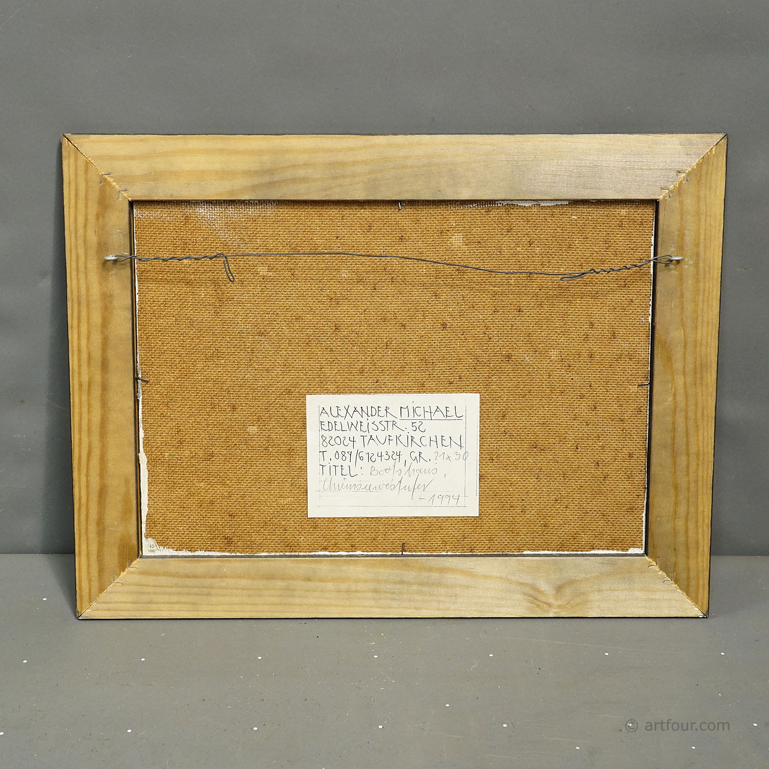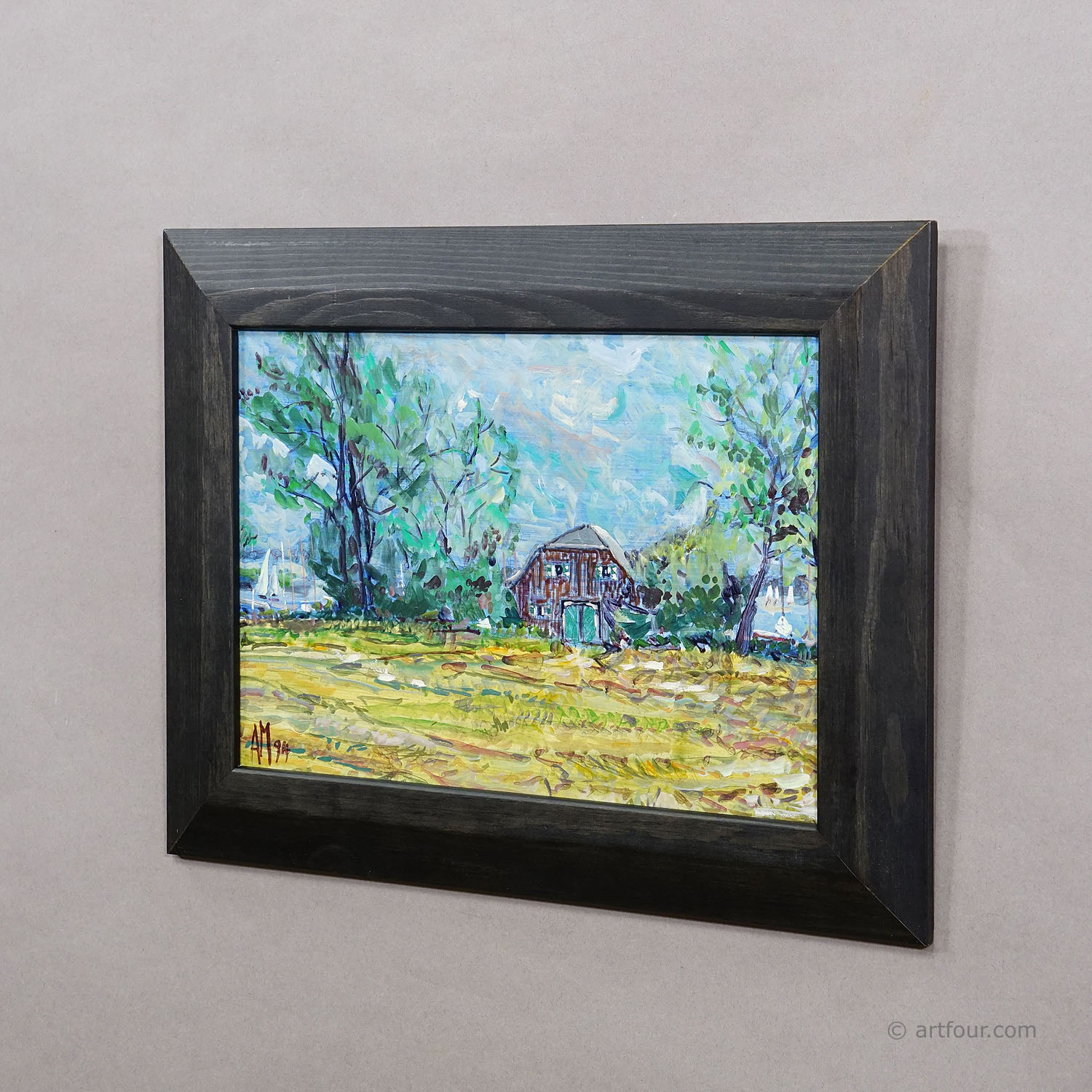 The painting 'Boathouse on the Western Shore of Lake Chiemsee' from 1994 depicts a tranquil rural scene along the lakeside and is a characteristic example of Alexander Michael’s landscape work. At the center of the composition stands a simple boathouse, surrounded by tall trees and lush vegetation. The color palette is dominated by fresh greens, blues, and warm yellow tones, applied with short, energetic brushstrokes. Sky, trees, and meadow appear animated and filled with light, creating a serene yet vibrant summer atmosphere. The work combines clear figurative elements with a free, impressionist-influenced painterly approach. The painting is signed and dated 'AM 94' in the lower left corner.