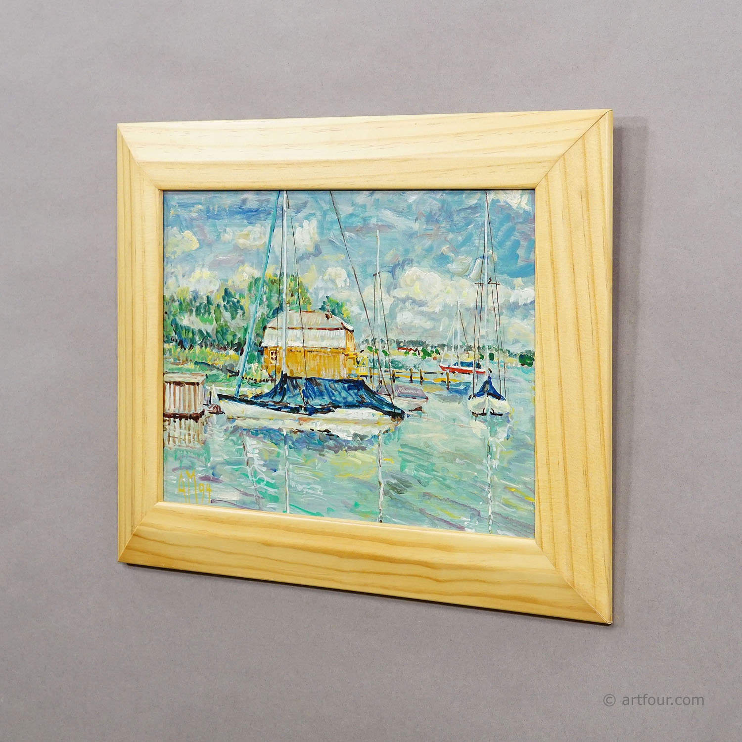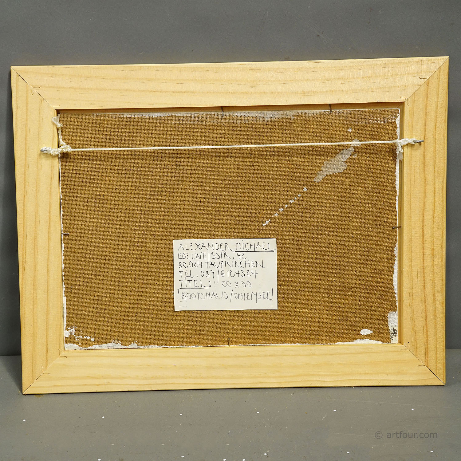 The painting 'Boathouse, Lake Chiemsee' from 1994 depicts a lively harbor scene on Lake Chiemsee, Bavaria. Using a loose, textured application of paint, the artist conveys the immediacy of the lakeside setting and the changing light reflected on the water. At the center of the composition stands a boathouse set directly on the water, its warm yellow tones contrasting vividly with the cool blues and greens of the lake. Several sailboats are moored nearby, their slender masts rising vertically and creating a rhythmic structure within the scene. In the background, shoreline elements with trees and additional boats are loosely suggested. The fresh color palette and dynamic painterly style create a bright, summery atmosphere, combining clear figurative elements with a distinctly impressionist-influenced approach.The painting is signed and dated 'AM 94' in the lower left corner.