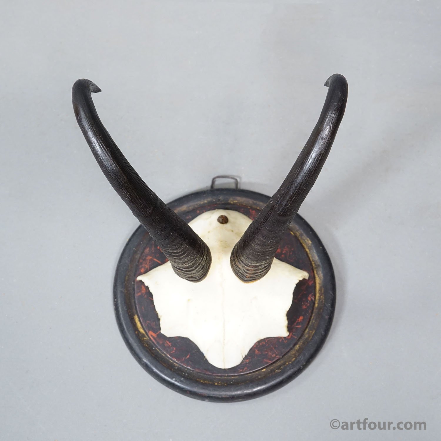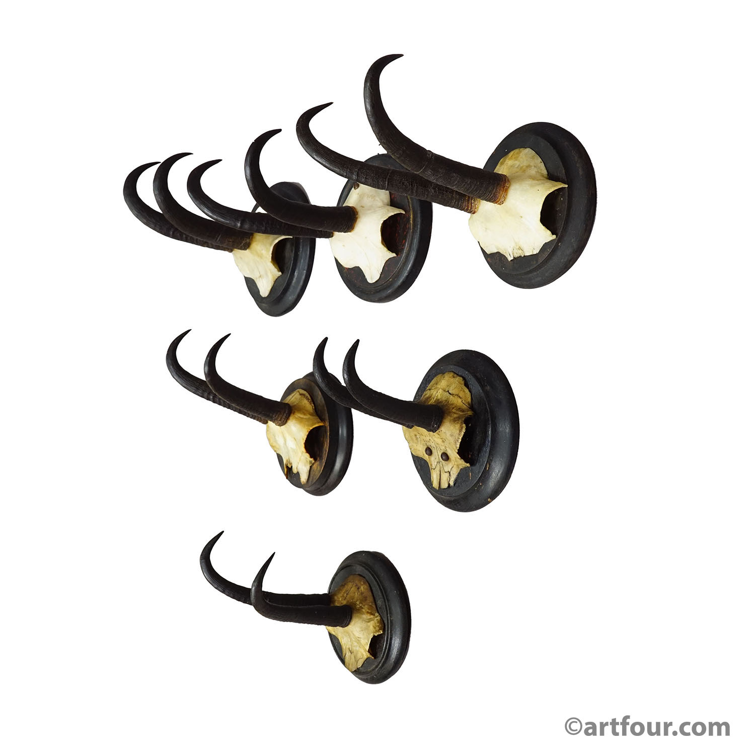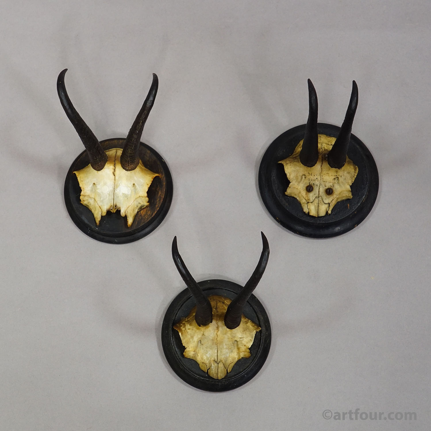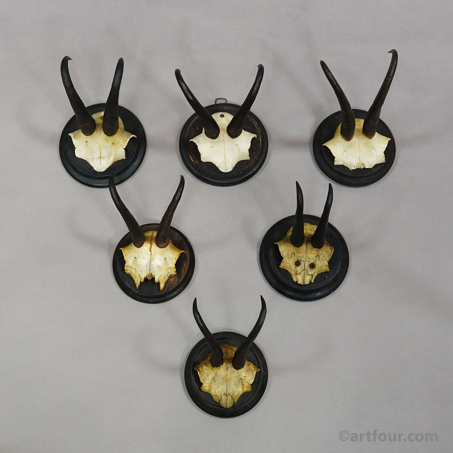Antique set of six chamois (Rupicapra rupicapra) trophies mounted on turned wooden plaques. The trophies were shot in Germany around the 1900s. The plaques are varnished in black. A great addition to every rustic cabin decoration.