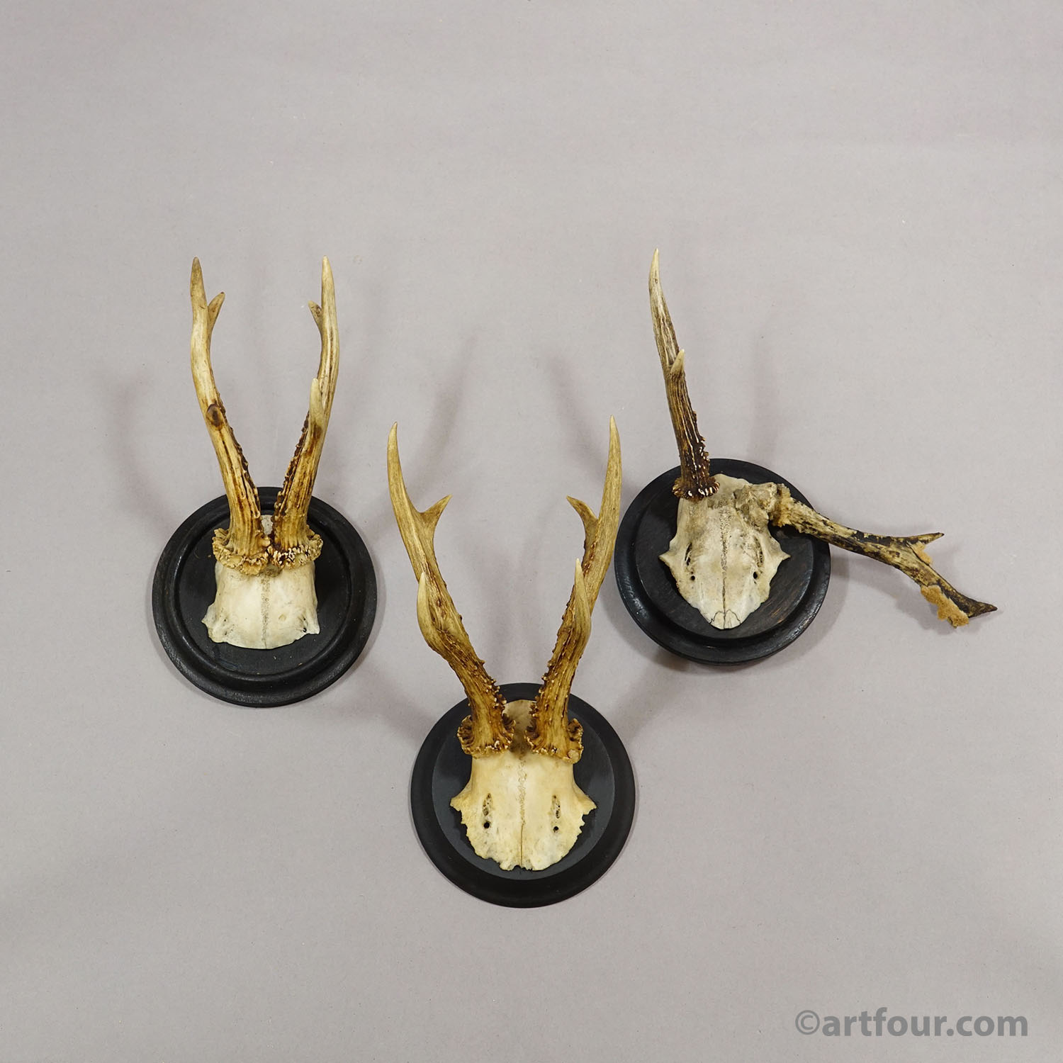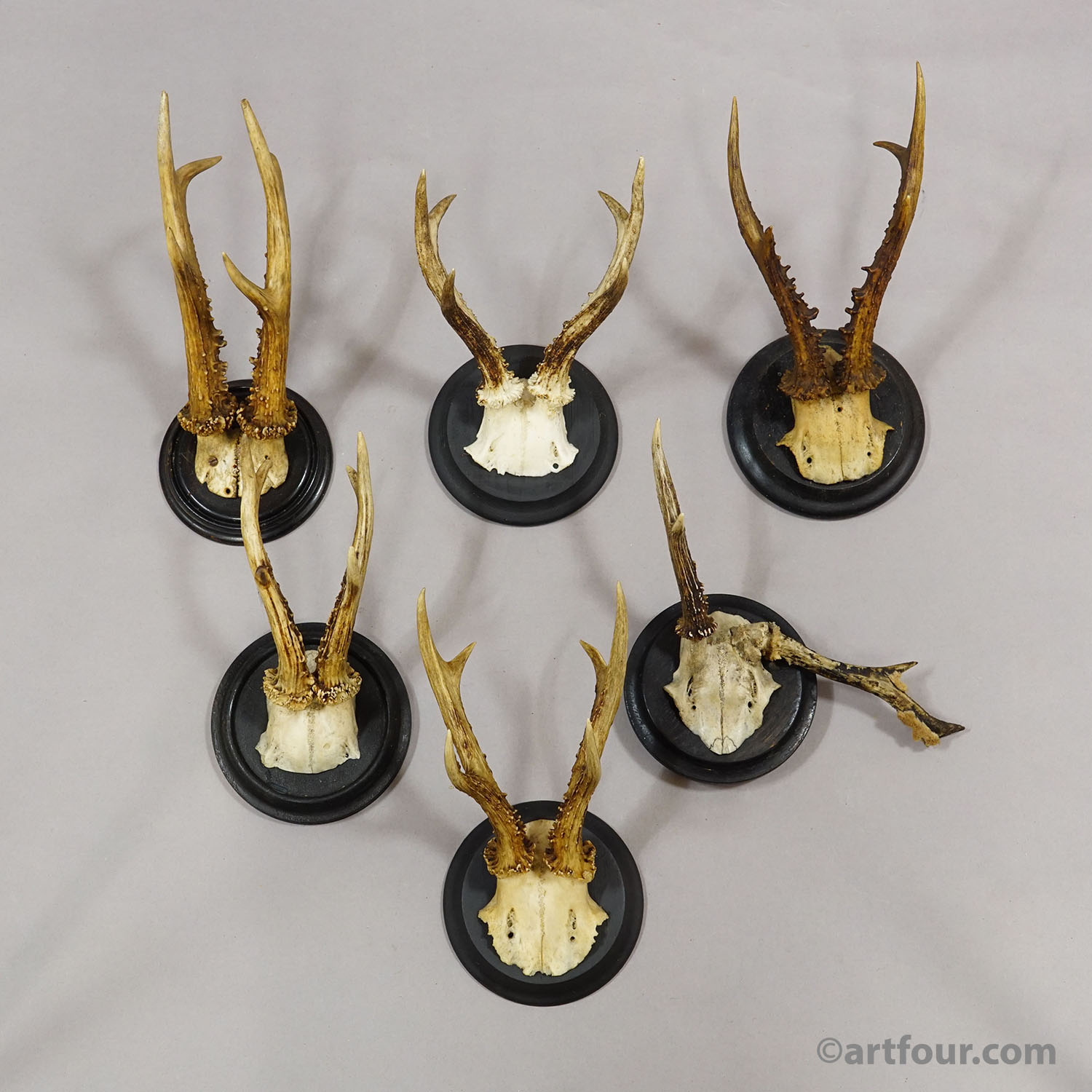 An antique set of six antique Black Forest roe deer (Capreolus capreolus) trophies mounted on turned wooden plaques, painted in black. The trophies were shot in Germany around 1910 - 1920. One of them has abnorm antlers. A great addition to every rustic cabin decoration.