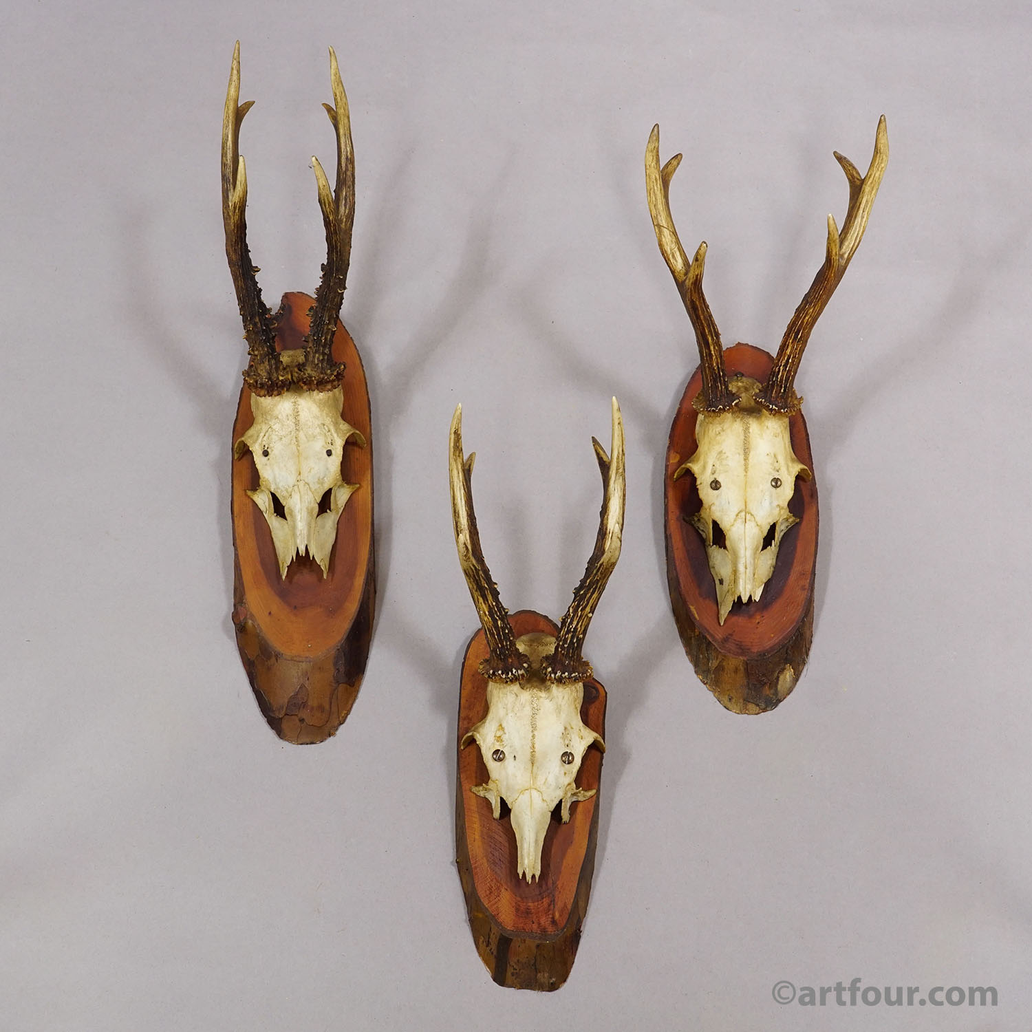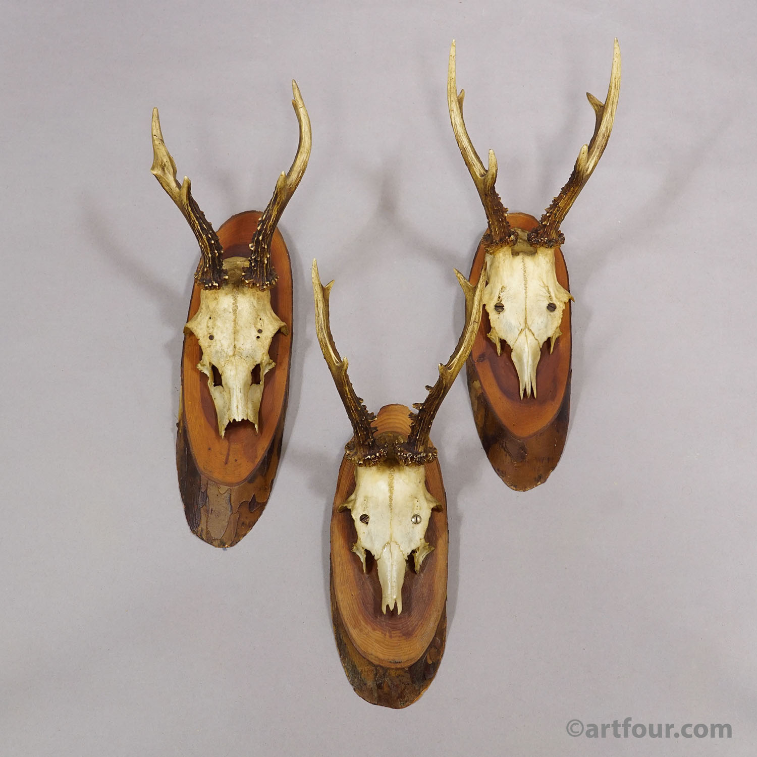 Mounted on wooden plaques, this vintage set features six large Black Forest roe deer (Capreolus capreolus) trophies. Taken in Germany around 1960, they make an excellent addition to any rustic cabin decoration.