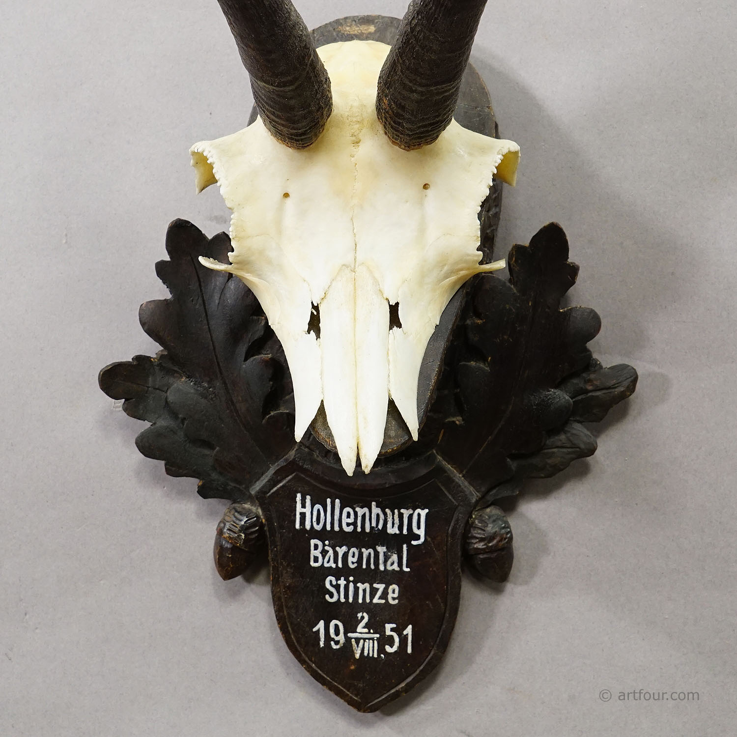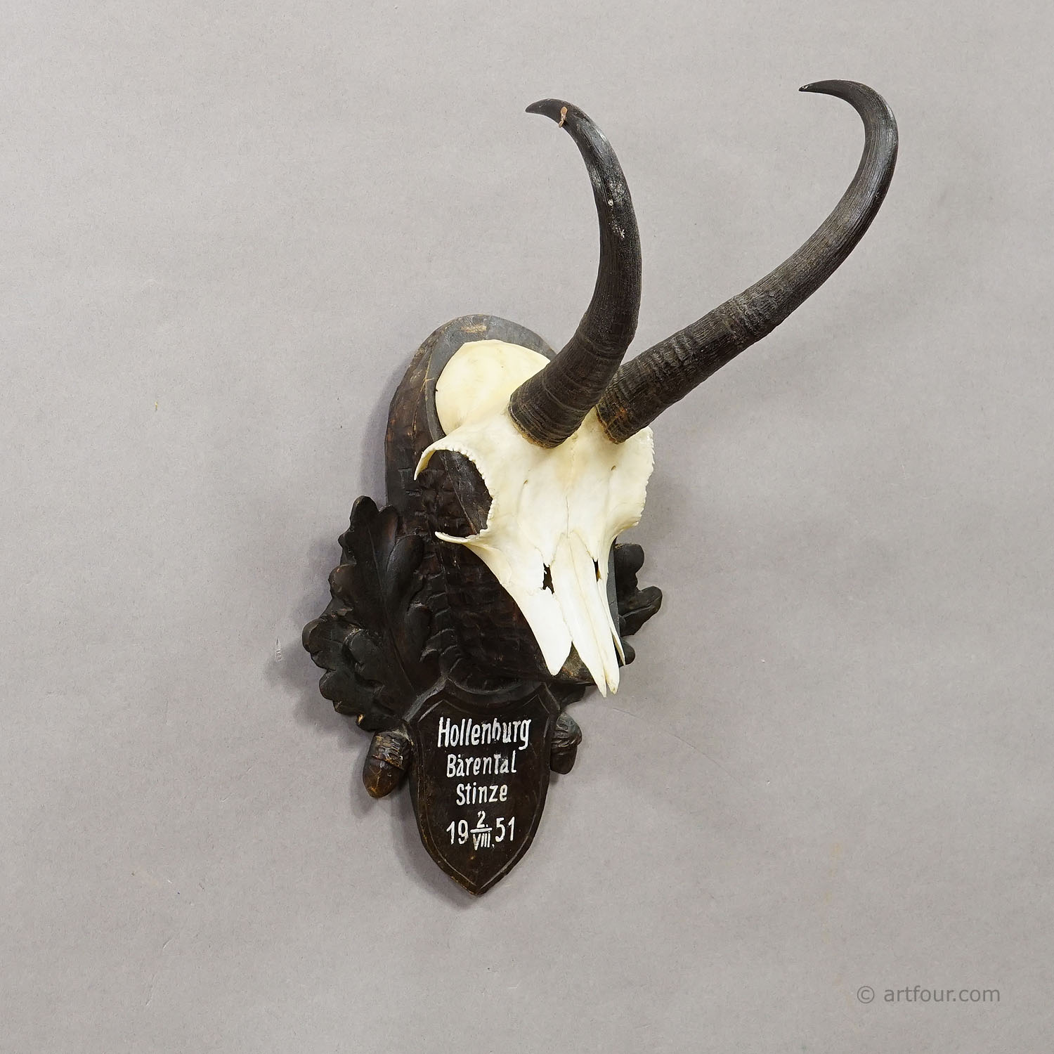 A decorative trophy of the chamois (Rupicapra rupicapra), mounted on a carved wooden plaque. The plaque is painted black and bears a hand-painted inscription with the dates of the hunt. The chamois was hunted in 1951 in Austria.