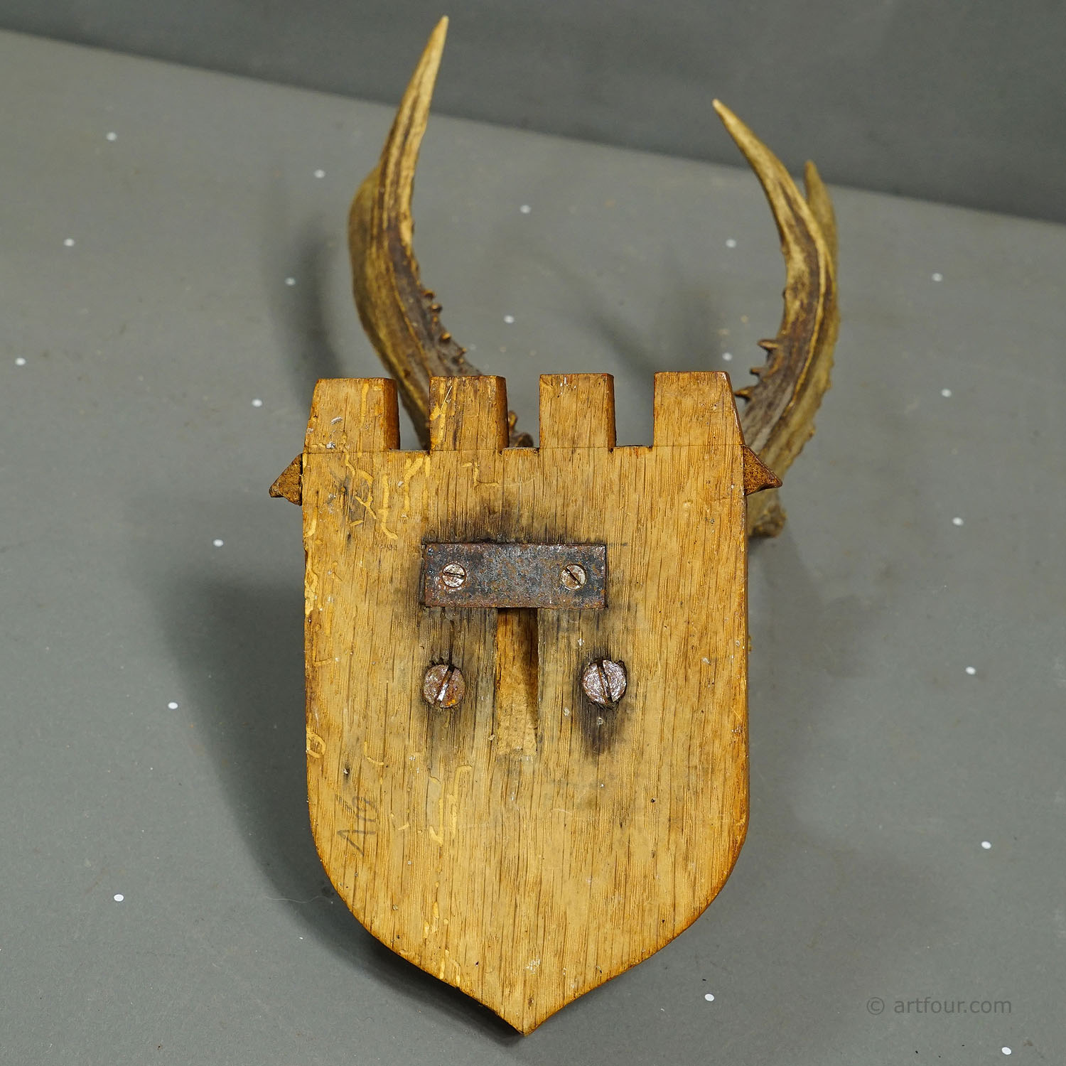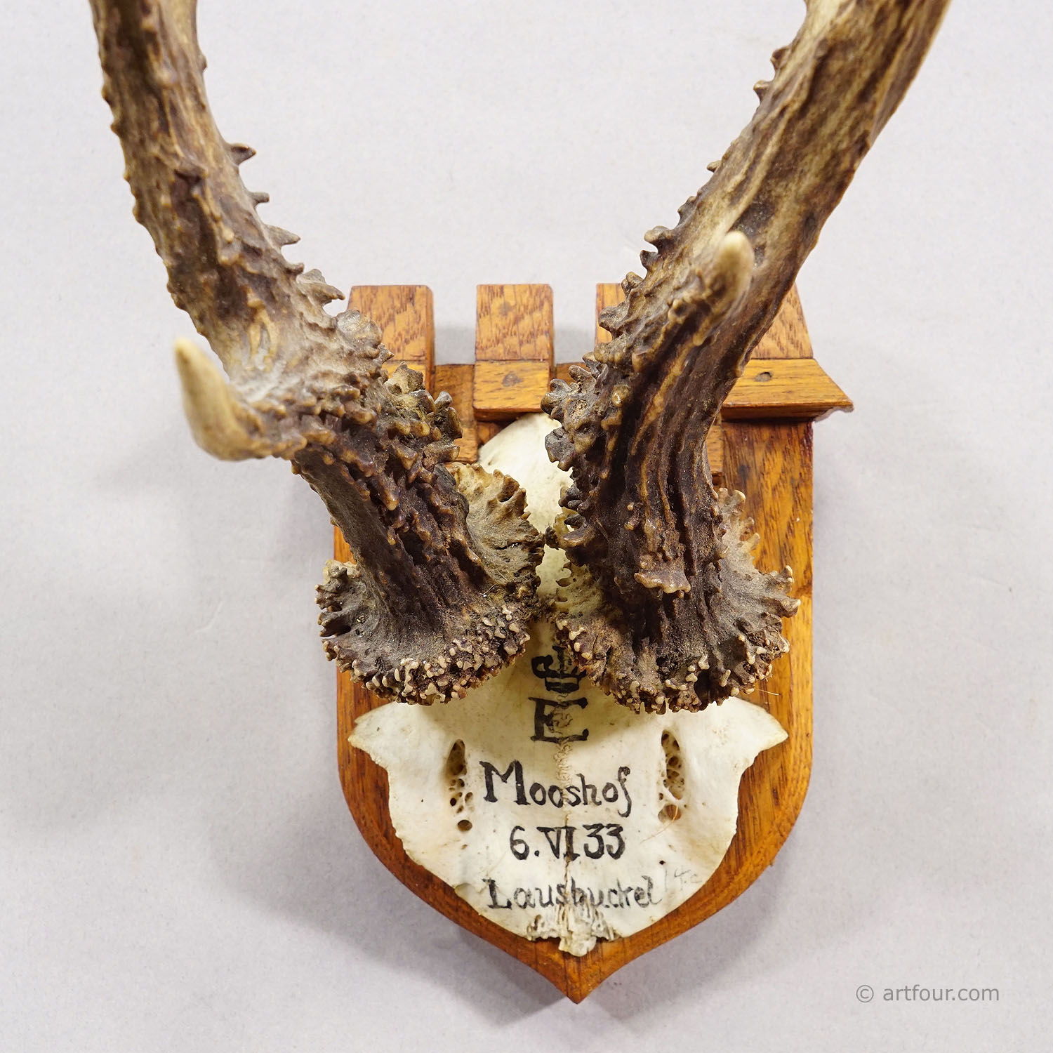 This hunting trophy features a roe deer (Cervus elaphus), mounted on a carved wooden plaque. The shape of the plaque is inspired by Neo-Gothic design and carved from oak wood. The trophy was shot in 1933. The skull bears a princely crown, a monogram, as well as the place and date of the hunt. The trophy was taken by Philipp Ernst, Prince of Thurn and Taxis (1908–1964). He was known for using distinctive symbols beyond the general family coat of arms on his hunting trophies and forestry markings. The initial ‘E’ beneath a princely crown were commonly used to clearly associate hunted game with his ownership and period. Today, such trophies are rare historical collectibles and are often displayed as decorative statement pieces with strong aristocratic and hunting heritage associations.
