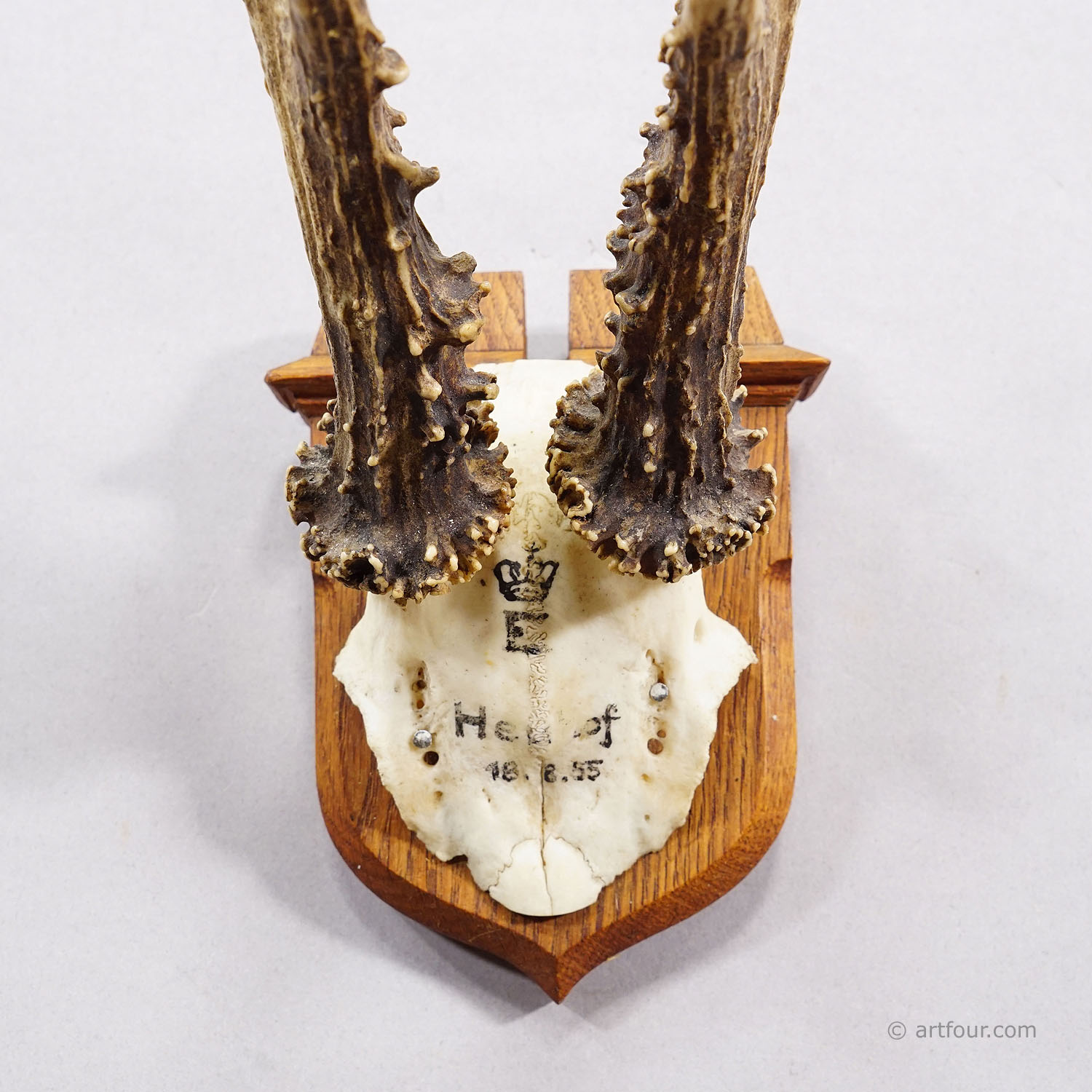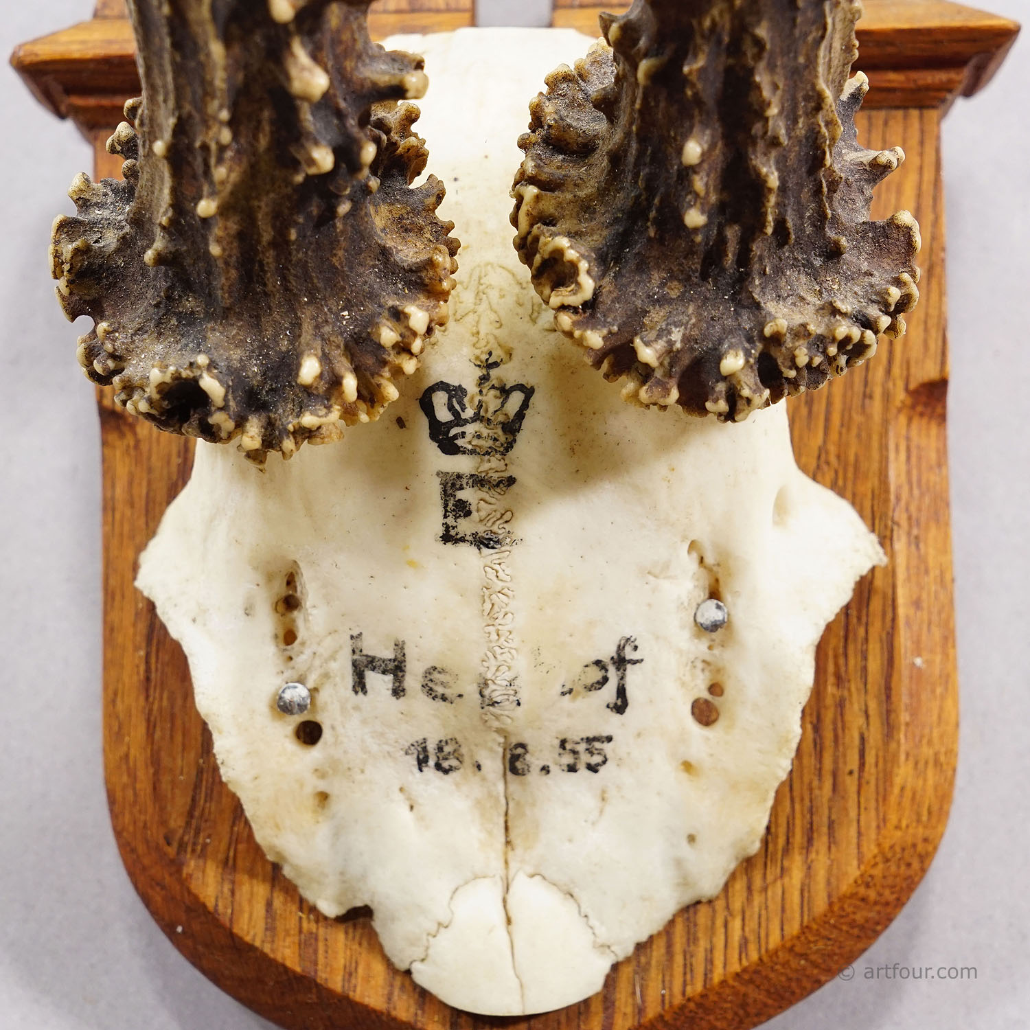 This hunting trophy features a roe deer (Cervus elaphus), mounted on a carved wooden plaque. The shape of the plaque is inspired by Neo-Gothic design and carved from oak wood. The trophy was shot in 1955. The skull bears a princely crown, a monogram, as well as the place and date of the hunt. The trophy was taken by Philipp Ernst, Prince of Thurn and Taxis (1908–1964). He was known for using distinctive symbols beyond the general family coat of arms on his hunting trophies and forestry markings. The initial ‘E’ beneath a princely crown were commonly used to clearly associate hunted game with his ownership and period. Today, such trophies are rare historical collectibles and are often displayed as decorative statement pieces with strong aristocratic and hunting heritage associations.