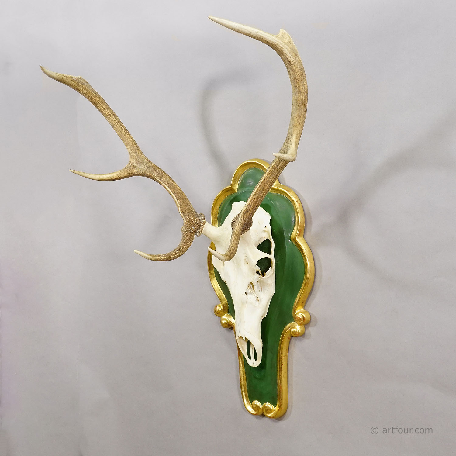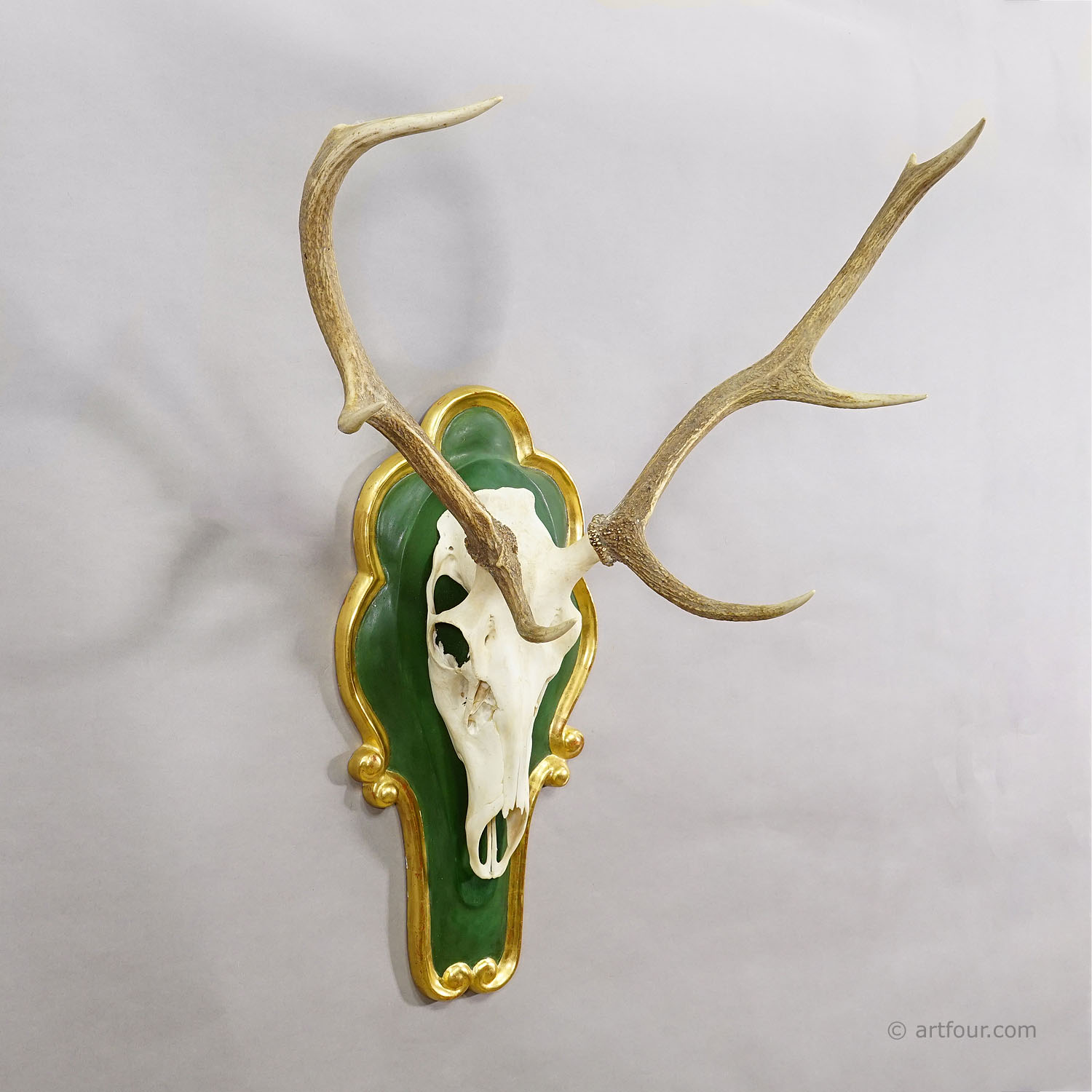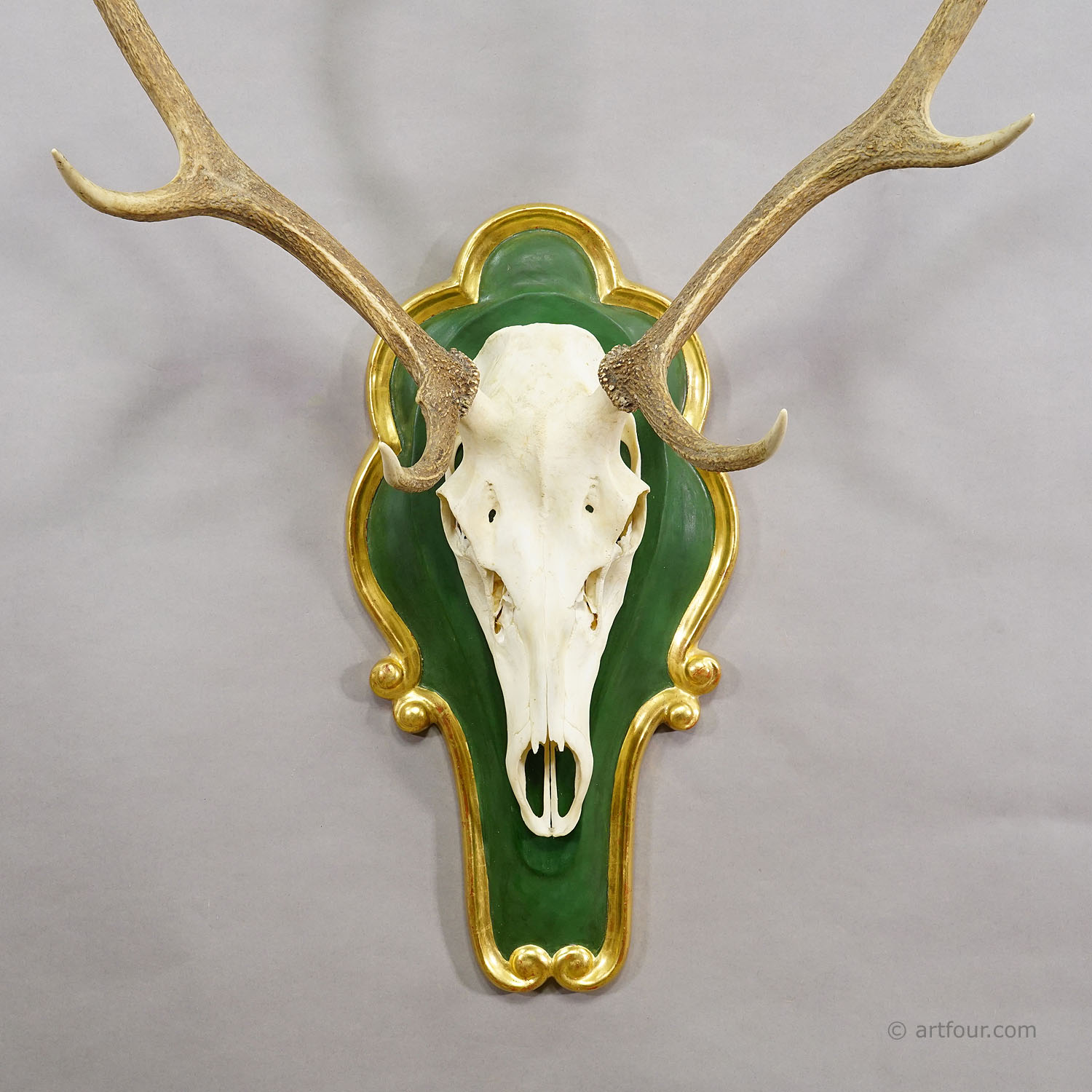 A large 8 pointer red deer (Cervus elaphus) trophy from the Black Forest. The antlers are mounted on a finely carved wooden plaque, painted in green and finished with an elegant gold-colored border.