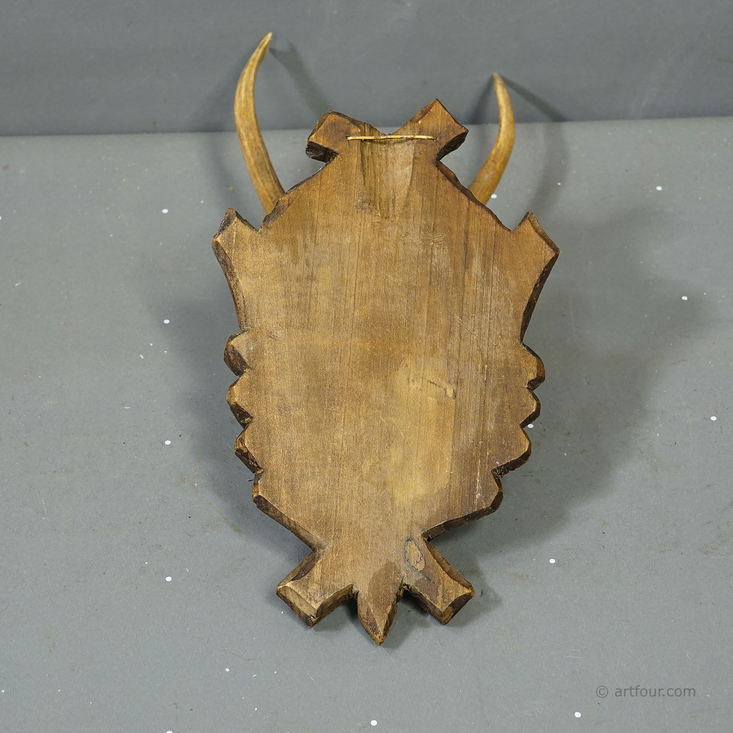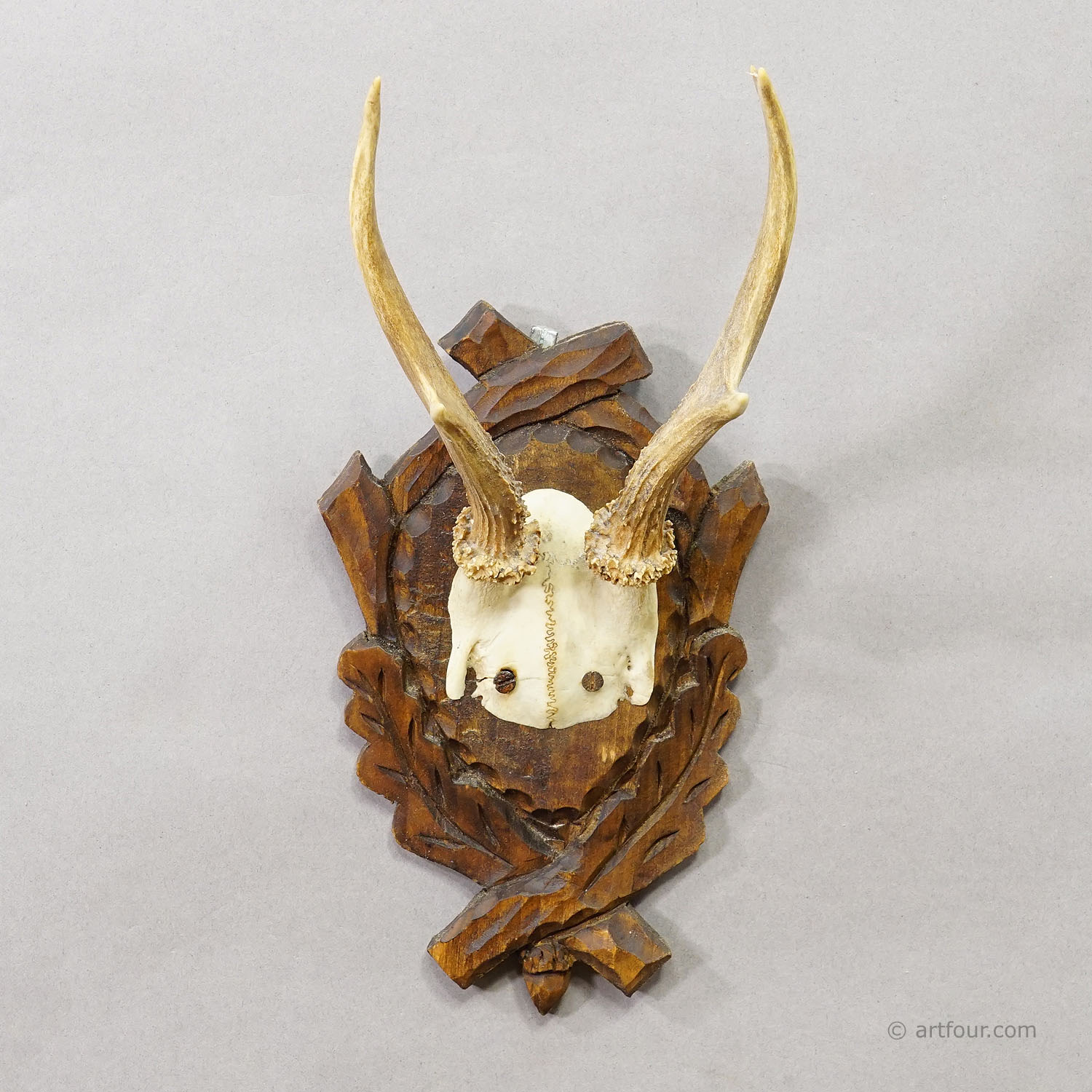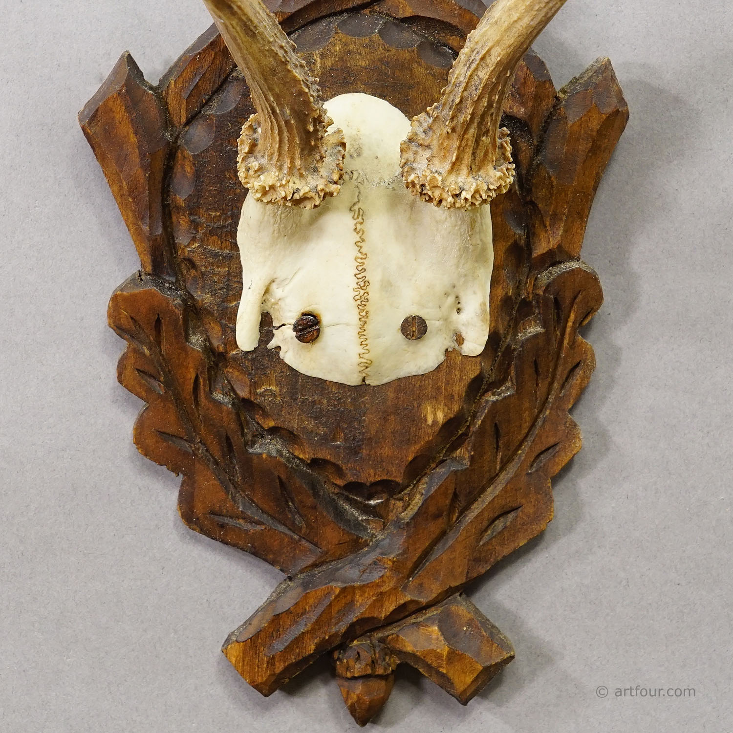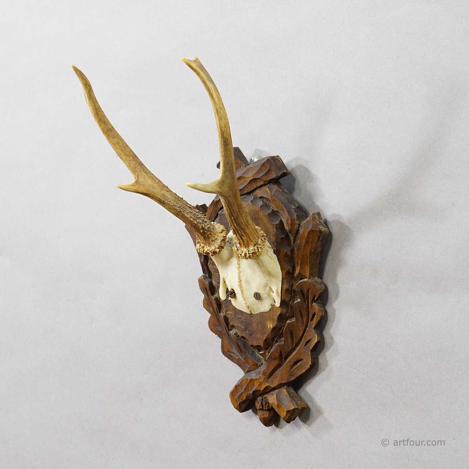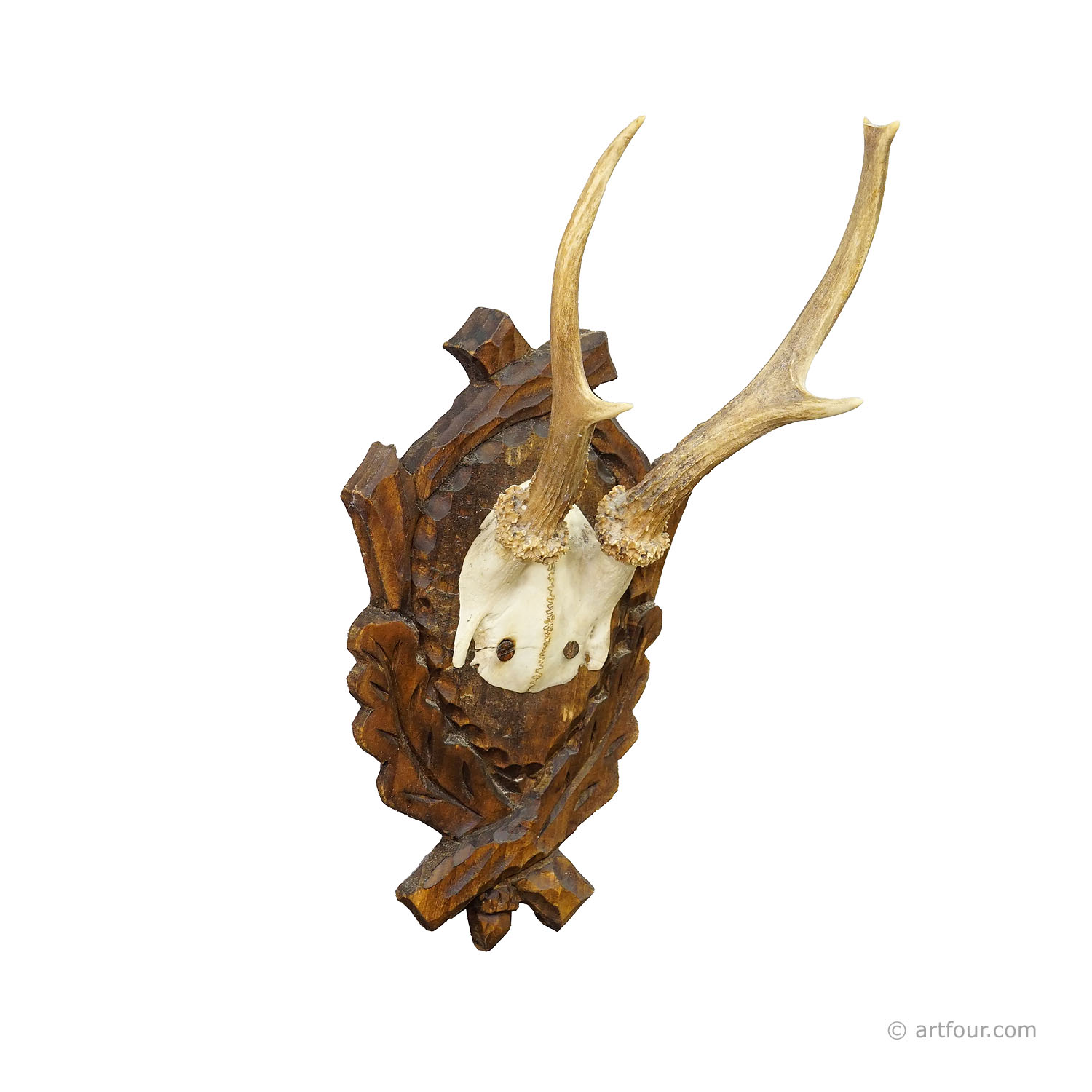An antique unequal 6 pointer red deer (Cervus elaphus) trophy from the Black Forest mounted on a carved and stained plaque. The trophy was shot in around the 1930s.