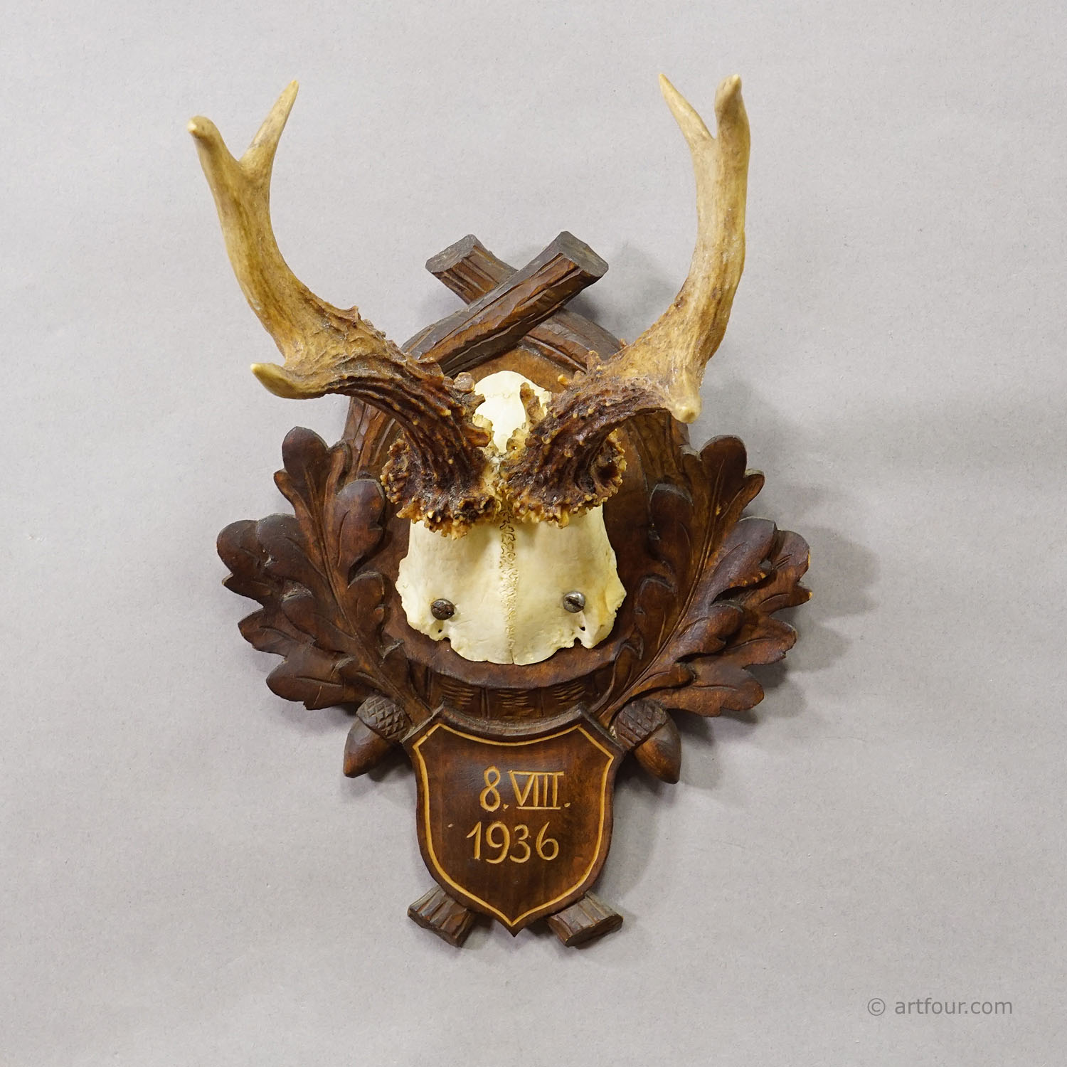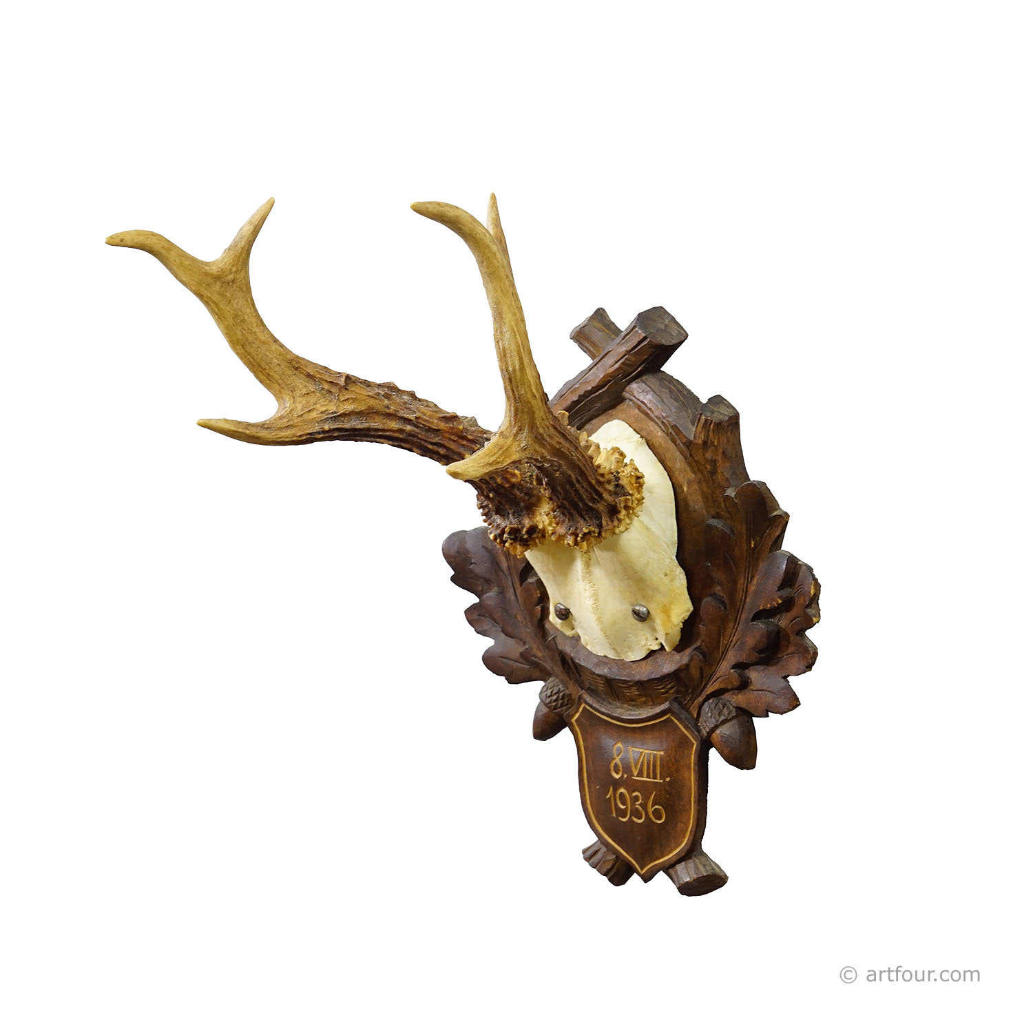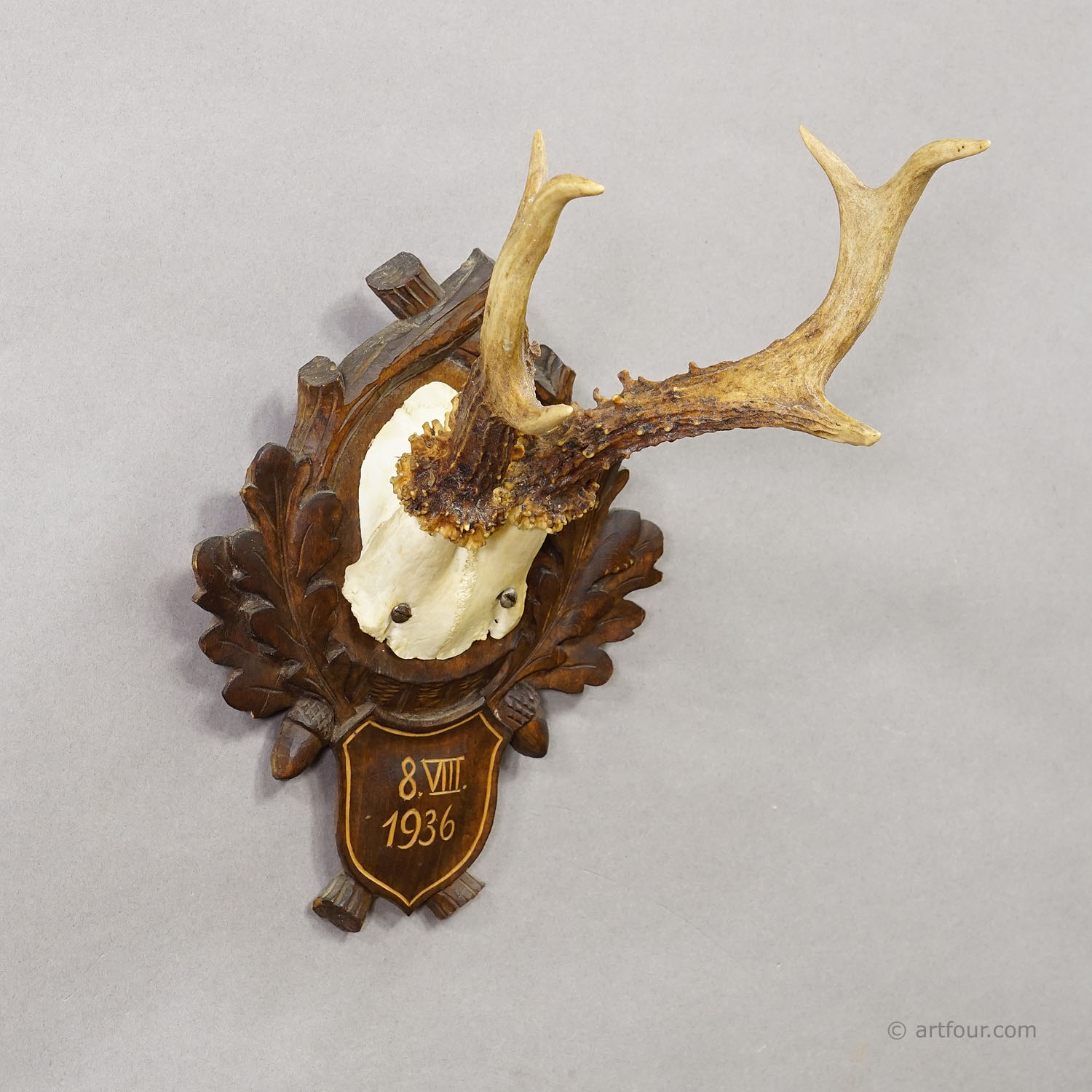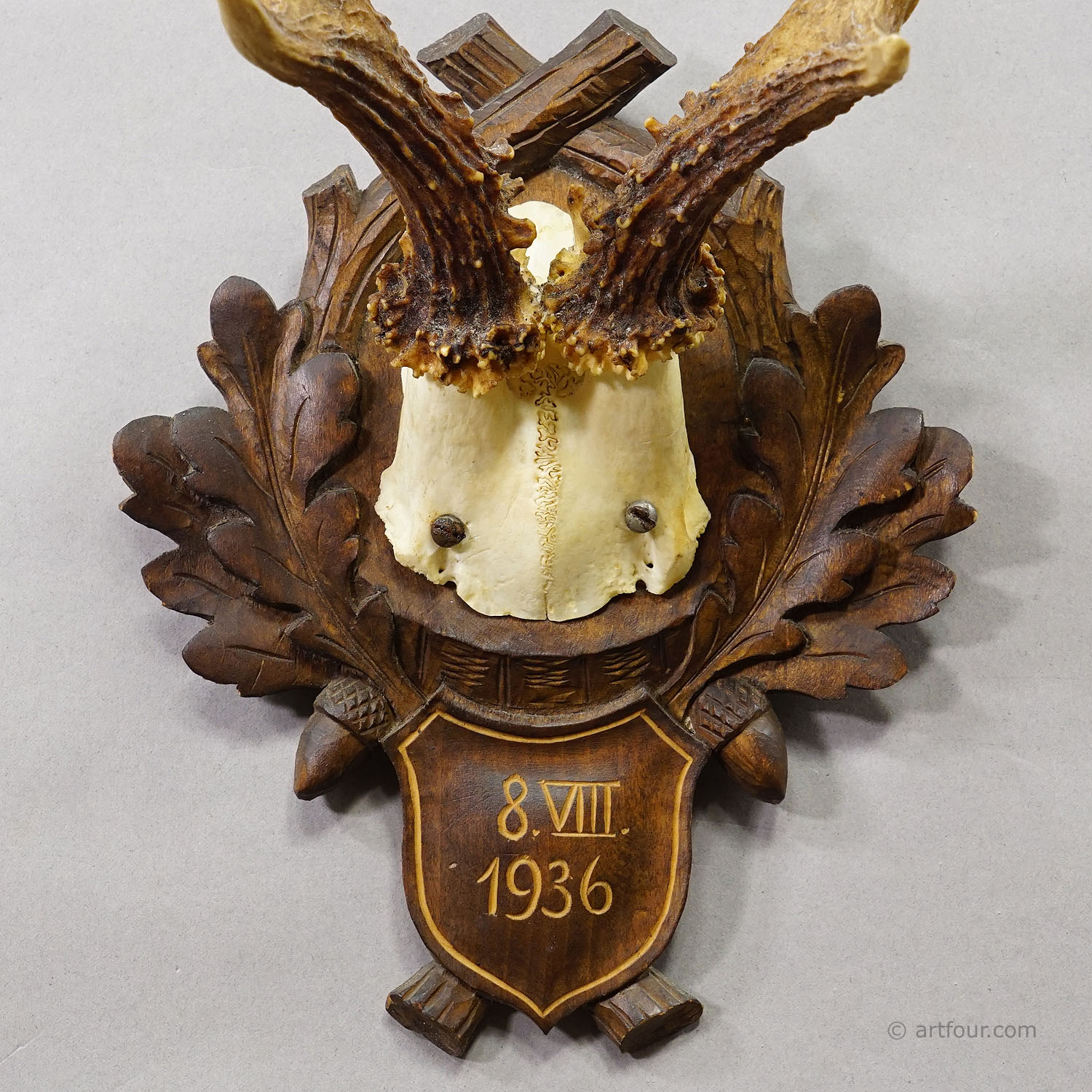 An antique 6 pointer red deer (Cervus elaphus) trophy from Hermesdorf, Germany, mounted on a carved wooden plaque. The trophy was shot in 1936. The date of the hunt was engraved into the wood on the front of the plaque.