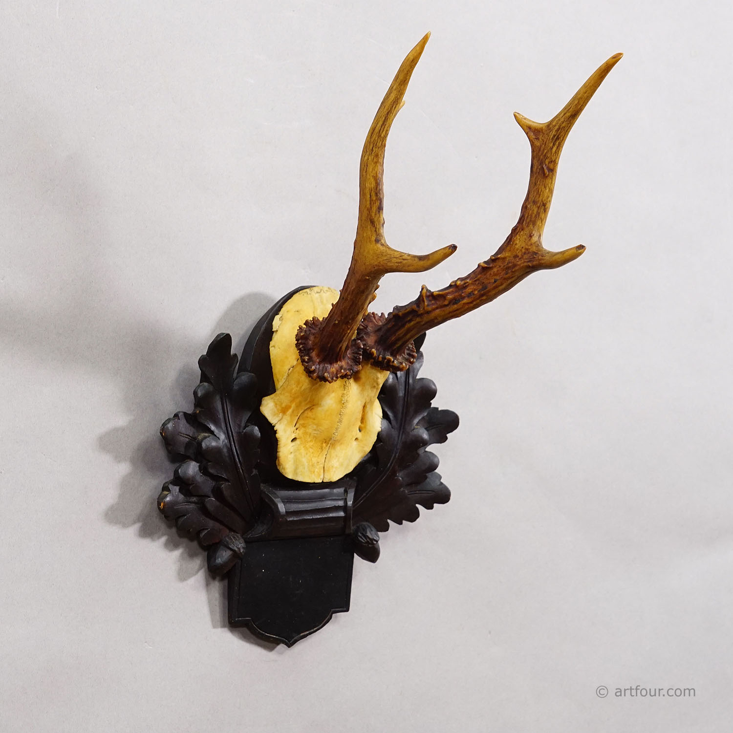 A great antique 6 ponter red deer (Cervus elaphus) trophy mounted on a carved wooden plaque. The trophy was shot in Germany arround 1900. Good condition.