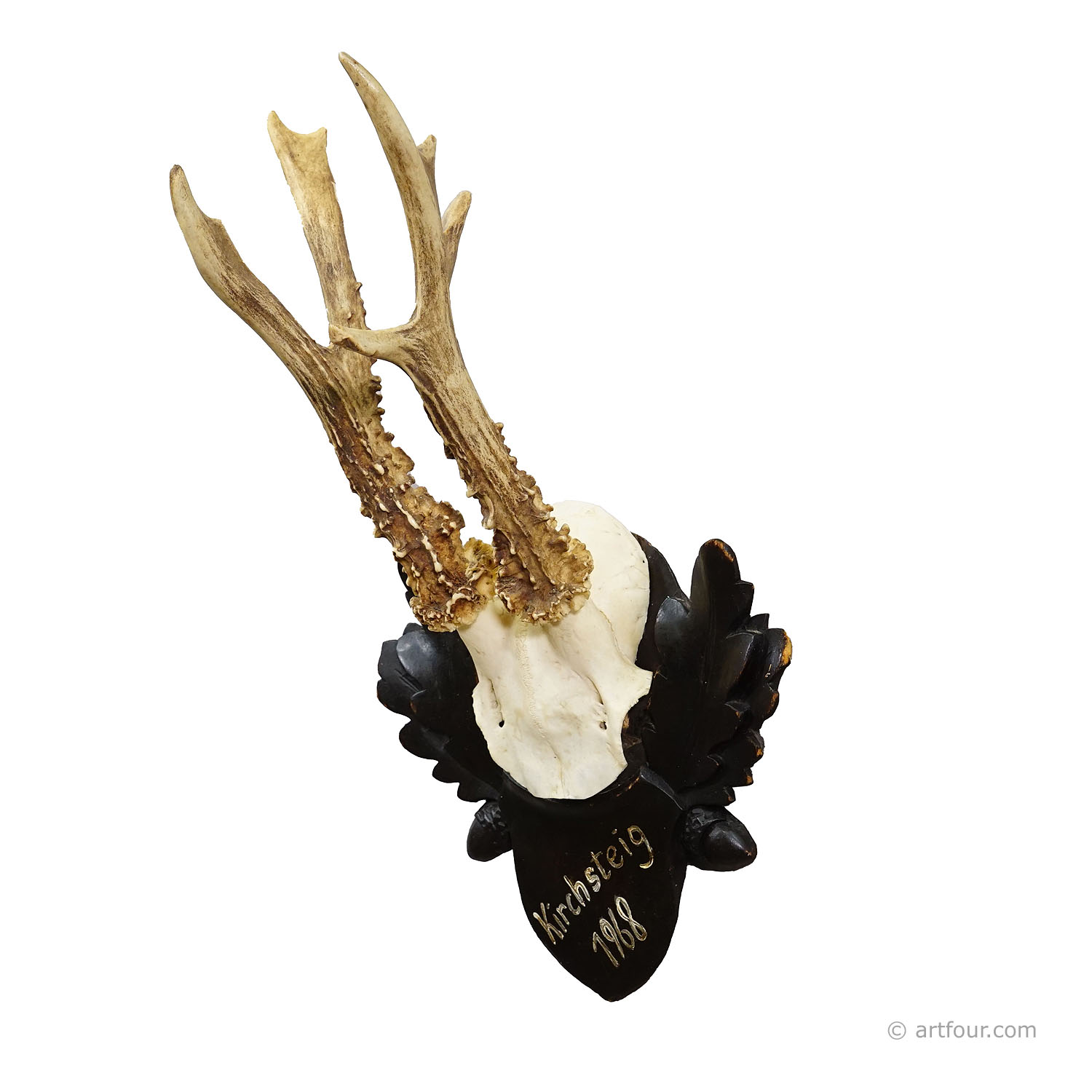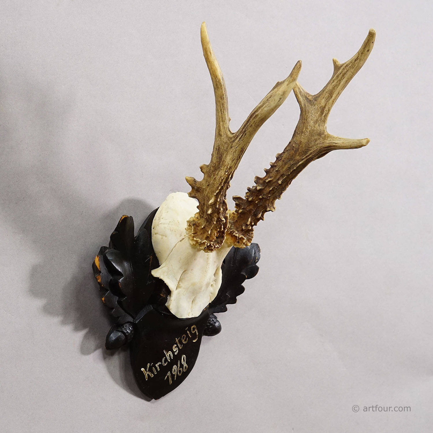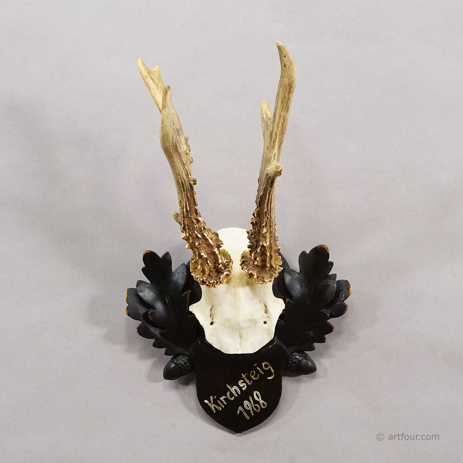 An antique red deer (Cervus elaphus) trophy mounted on a carved wooden plaque. The trophy was shot in Germany arround 1968. It features a handwritten inscription with date and place of the hunt on frontside of the plaque. Good condition.