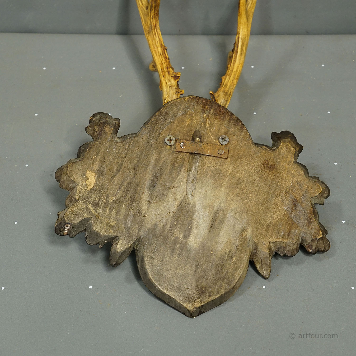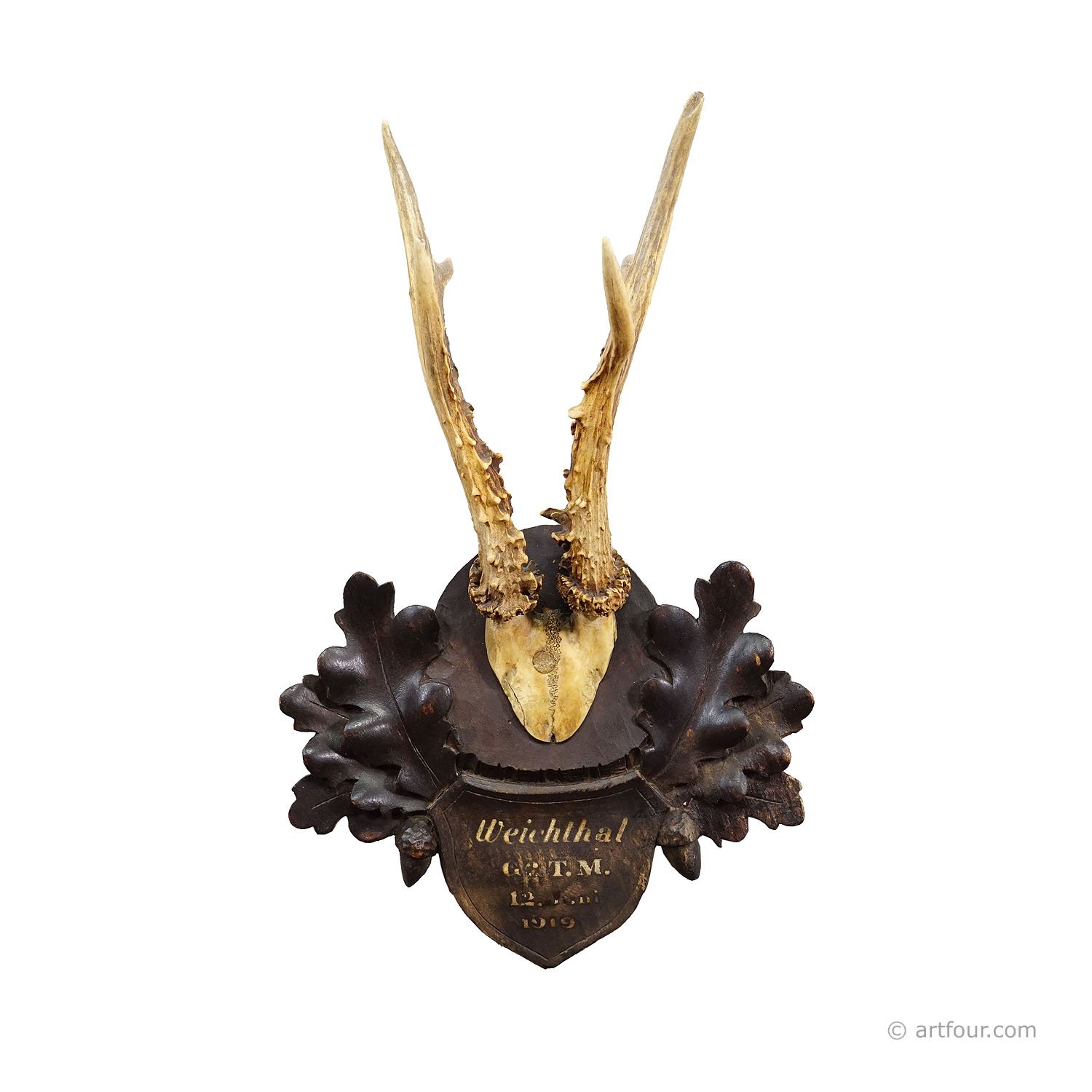 An antique red deer (Capreolus capreolus) trophy on a wooden carved plaque with carved oak leaves and acorns. The trophy was shot 1919 in Lower Austria. The place and date of the hunt are engraved on the plaque. Good condition.