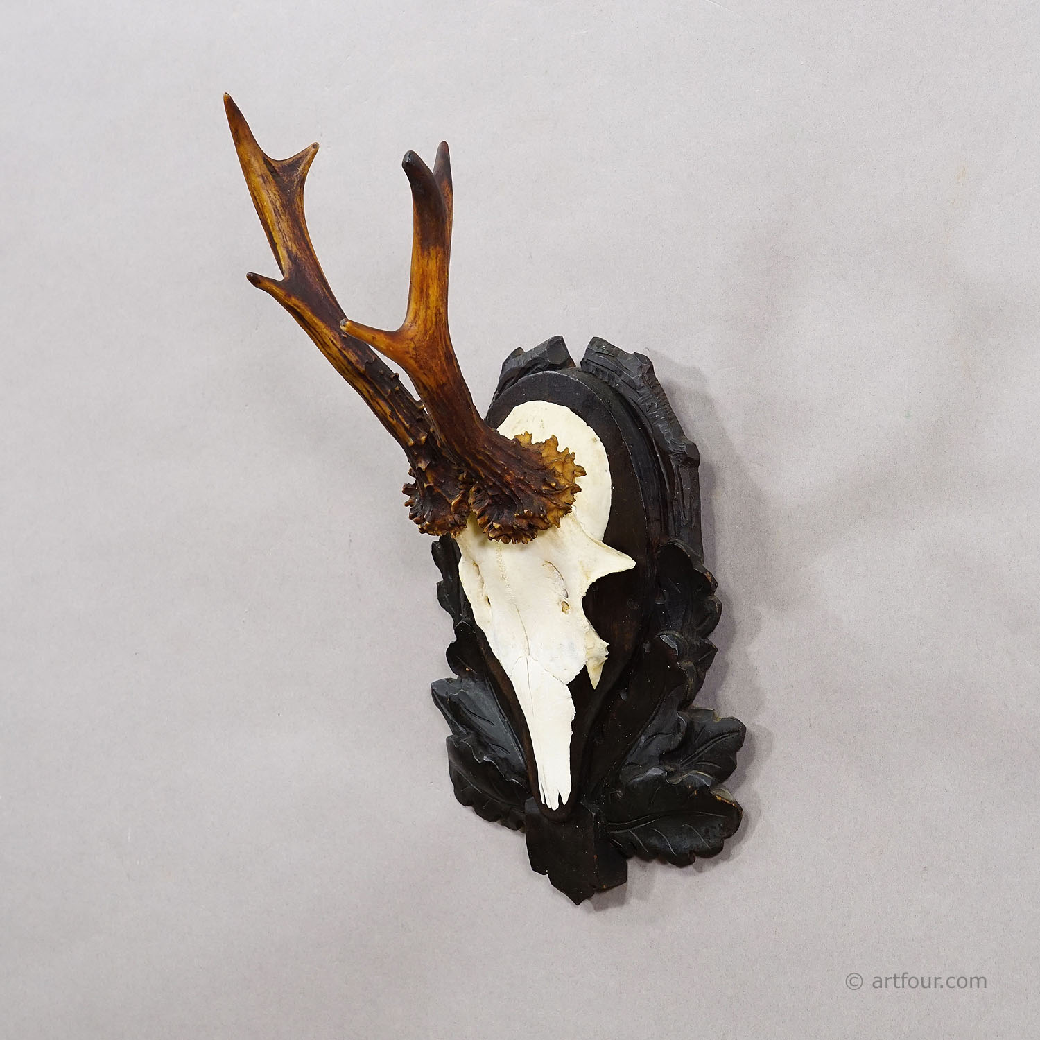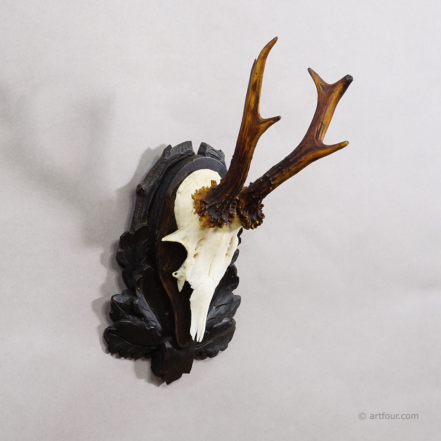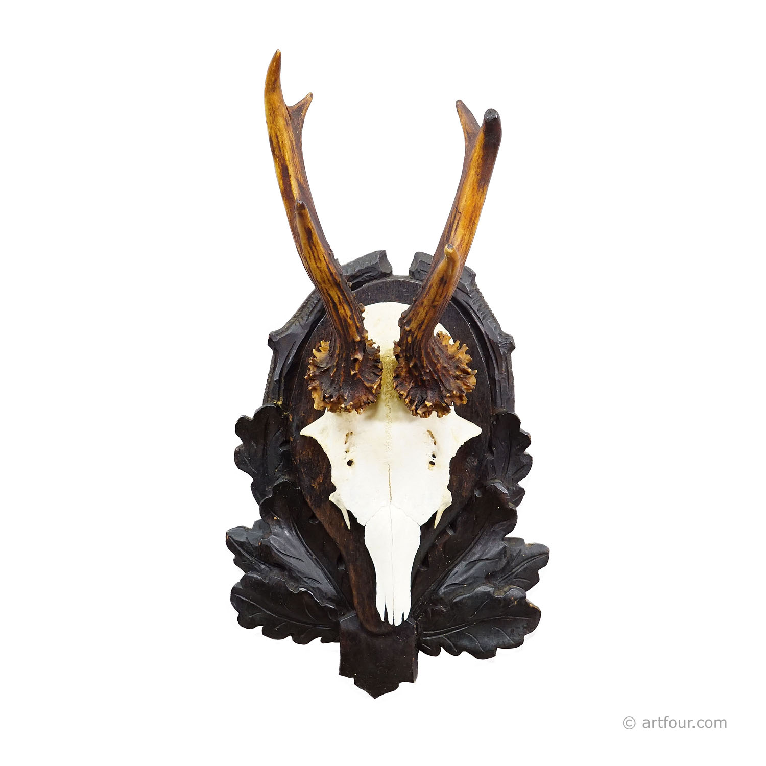 An antique 6 pointer red deer (Capreolus capreolus) trophy on a wooden carved plaque with carved oak leaves. The trophy was shot arround 1930 in Germany. Good condition.