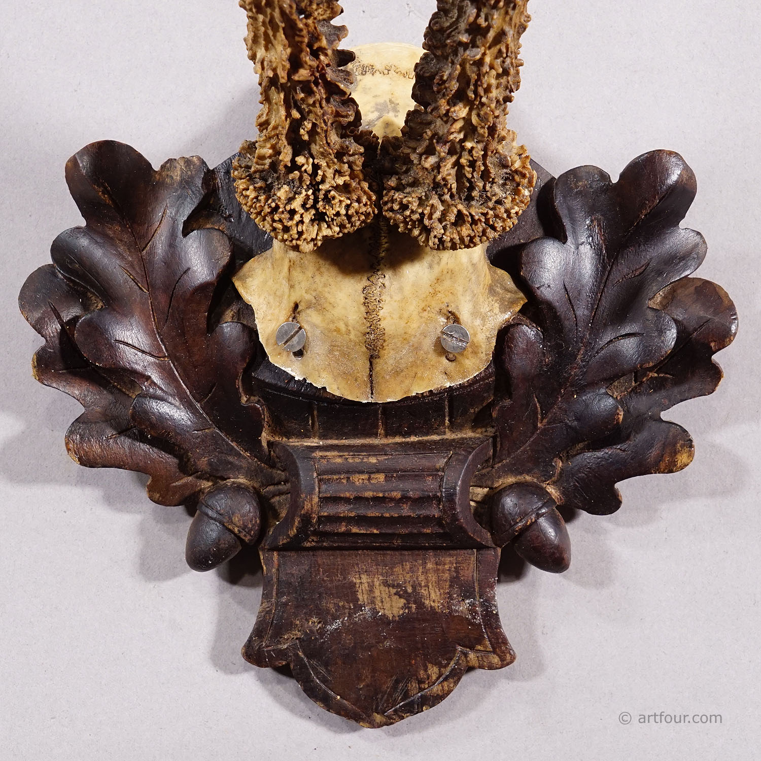 An antique red deer (Capreolus capreolus) trophy on a wooden carved plaque with dark brown finish which features acorns, oak leaves. The trophy was shot around 1910. Good condition.