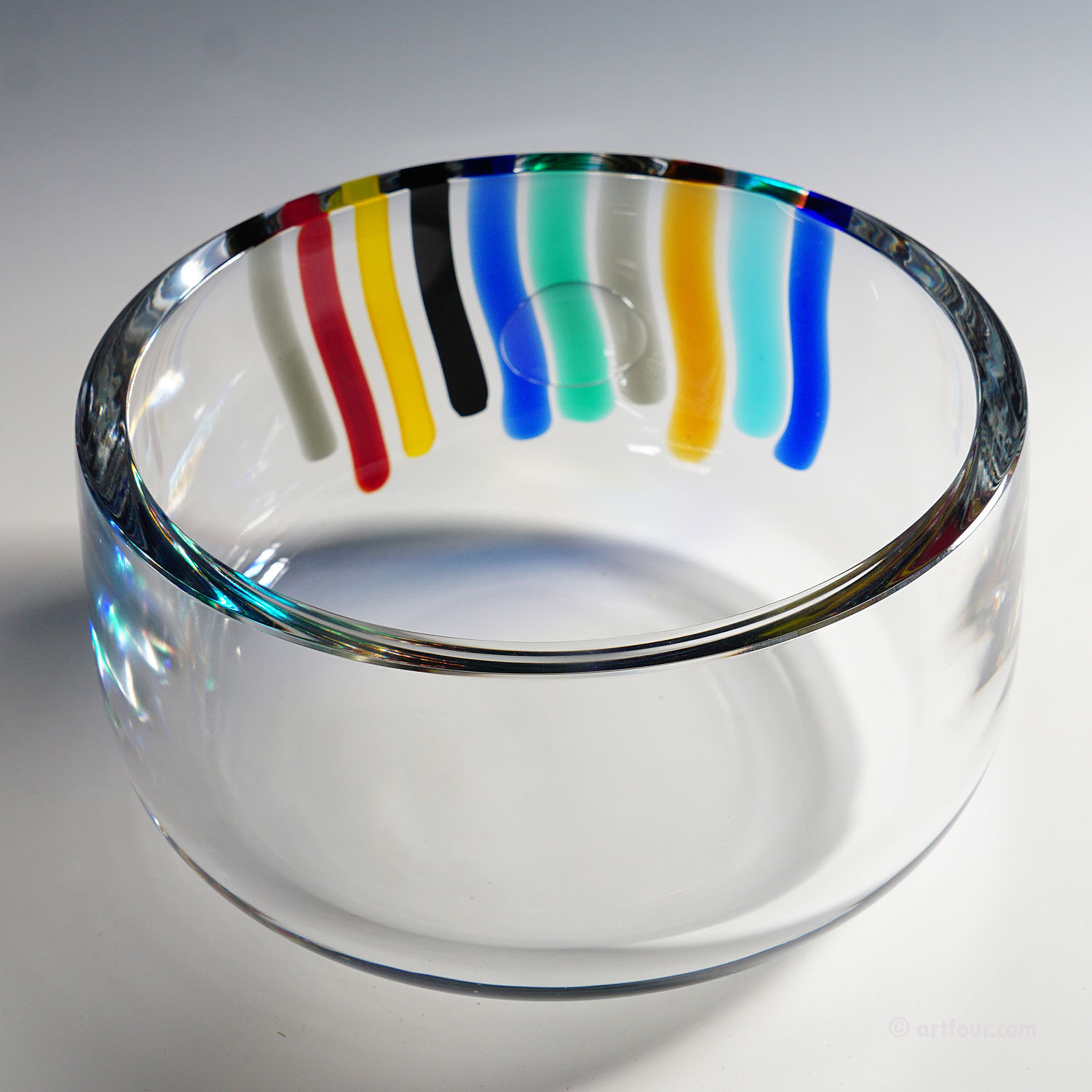 A large and heavy Murano sommerso glass bowl with a colour waterfall or rainbow. Manufactured by Ferro & Lazzarini circa 1980s. Manufactured in thick crystal clear glass with applied glass ribbons in multiple coloures. A great example of the Murano art glass production of the late 20th century.