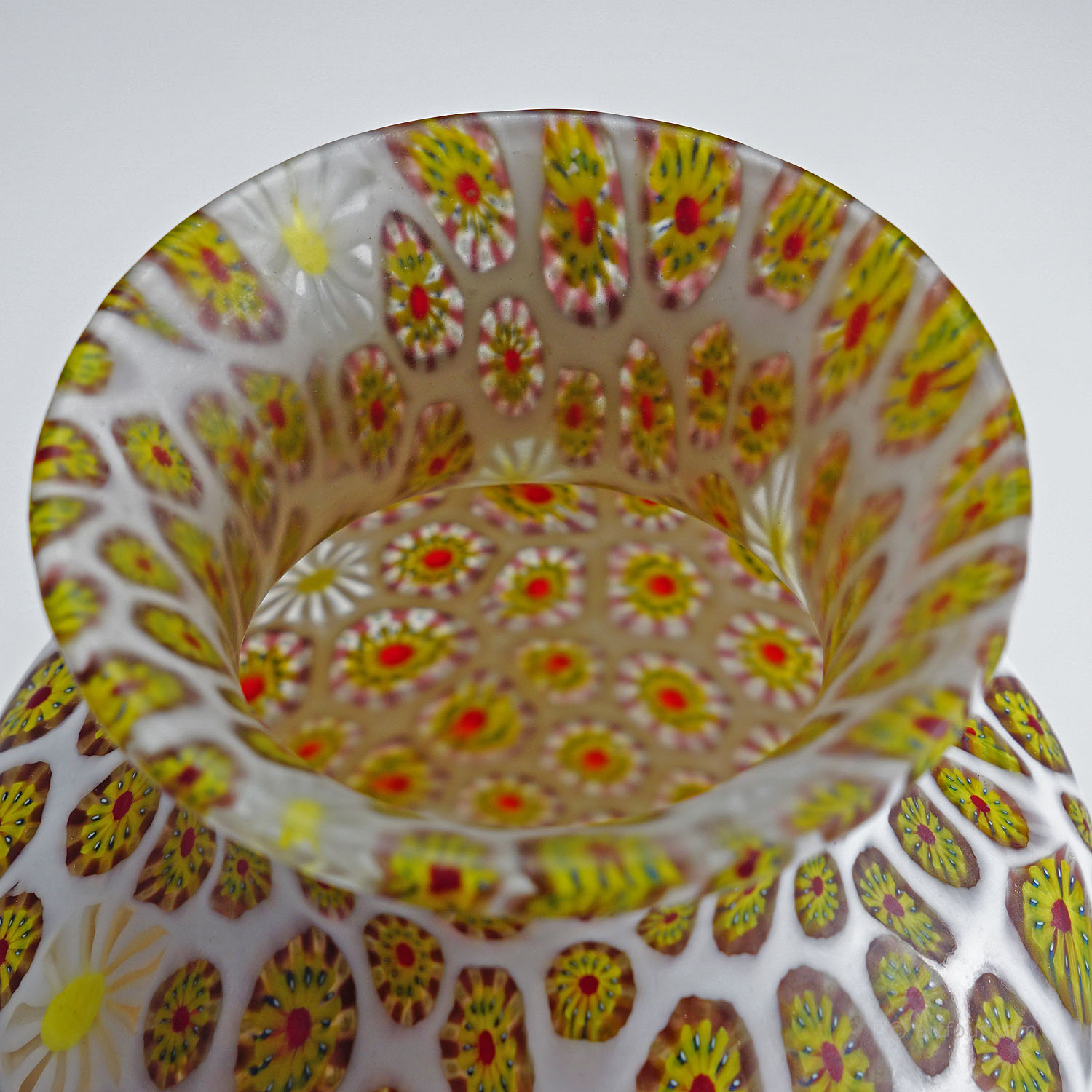 A large murrine glass vase designed by Ermanno Toso and manufactured by Vetreria Fratelli Toso, Murano around 1965. Made of clear glass with fused, multicolored Redentore and Kiku murrines. Surface with acid etched matte finish. The vase is an authentic example of mid 20th century Murano art glass. Original company lable on the base.