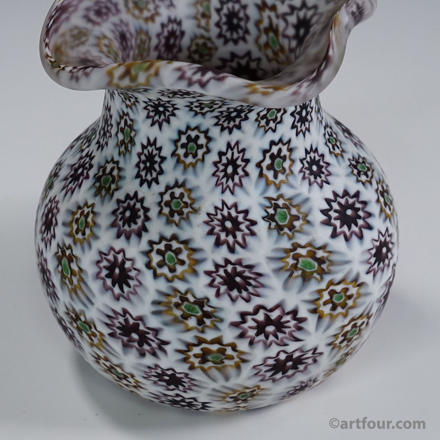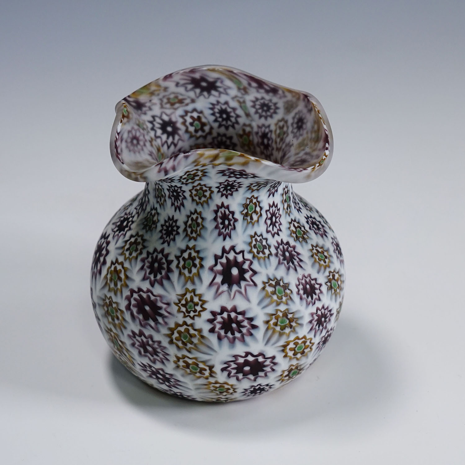 A colorful millefiori murrine glass vase manufactured by Vetreria Fratelli Toso, Murano around 1920. Made of multicolored polychrome murrines which were melted together. Surface with acid etched matte finish. The vase is an authentic example of early 20th century Murano art glass. It was part of a large Fratelli Toso glass collection with over 600 pieces - collected since the 1970s.