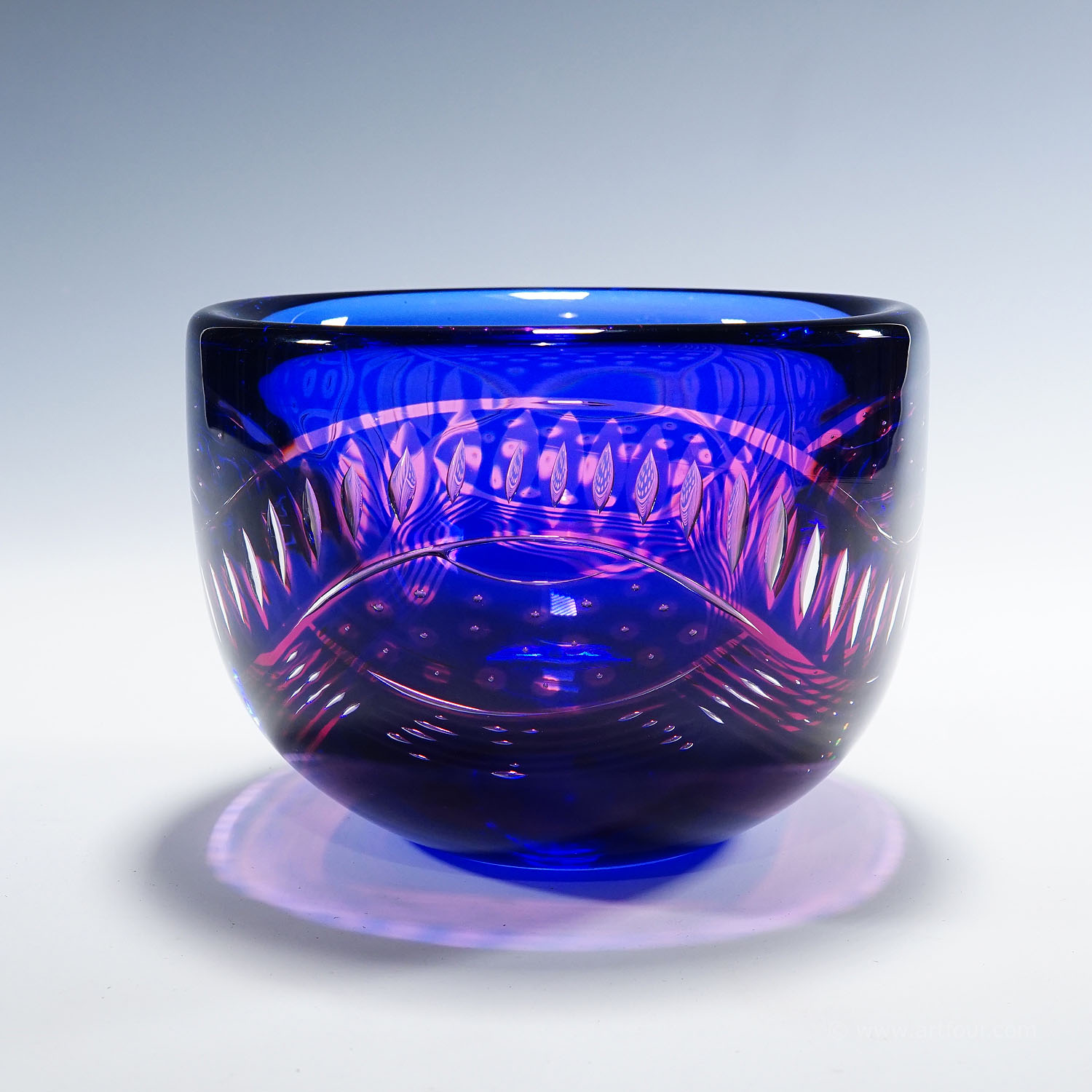 A large bowl of the Ariel series designed by Jan Johannsen for Orrefors Sweden. Colorless glass with a blue and pink overlay, cooled, cutted with a geometrical pattern, re-heated and cased with colorless glass. This example dates to 1953. Signed with: 'Orrefors Ariel Nr. 365 E 8 Jan Johansson'. An authentic piece of Midcentury Modern Scandinavian glass design. Weight 4,14 kilos (9.15 lb)