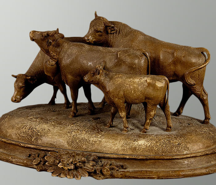 Tourists were not only crazy about wild animals but they were also inspired by the typical domestic animals living in Swiss villages. Cows with their characteristic bells represent a mystery to rural life. A farm animal dedicated for production but still noticed as wild and unbroken, is an ideal illustration for artists to haunt. Goats, the headstrong all-rounder and the oldest domesticated animal, can be illustrated with great fidelity in sculptures. The St .Bernhard dog is a perfect representative of men´s best friend and all its characters can be depicted in wood.