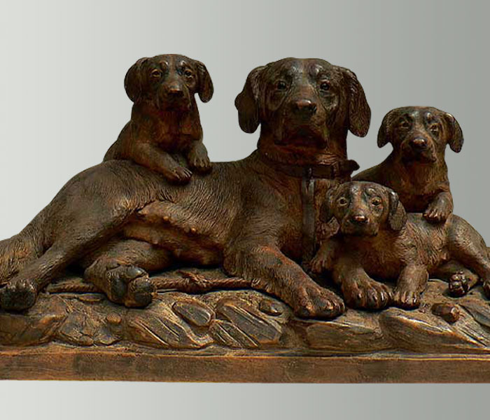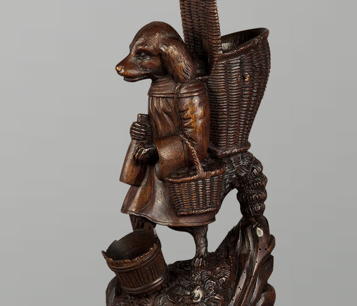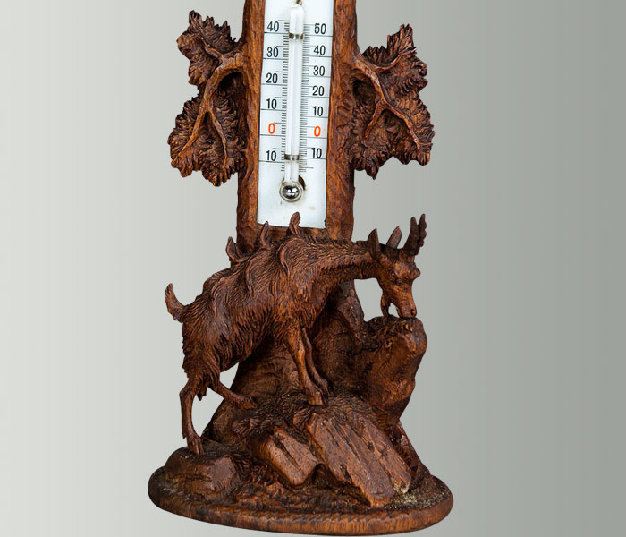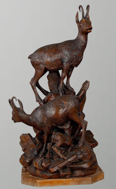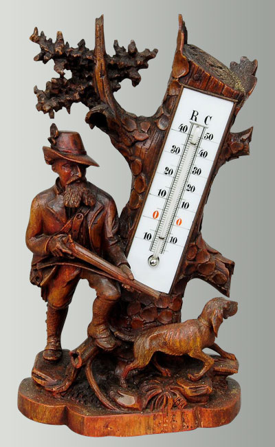 The simple life in the Alps appealed the foreigners and encouraged artists to focus on human figures, especially hunters, poachers and shepherds. Another inspiring category were ornamental carvings of articles of daily use, such as clocks or thermometers. Since 1850 Brienz carvers started to focus on creating sculptures showing men, animals and floral motives with an outstanding and independent artist standard.