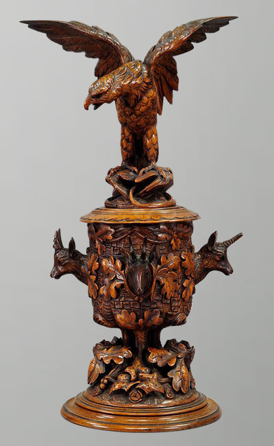 Some wood carving exemplars are sold under the name of "Black Forest wood carving". Strange to say these carvings are mostly not originated from the area of the Black Forest in South of Germany. Of course there are famous carving arts from the Black Forest region, the well-known CUCKOO CLOCKS.